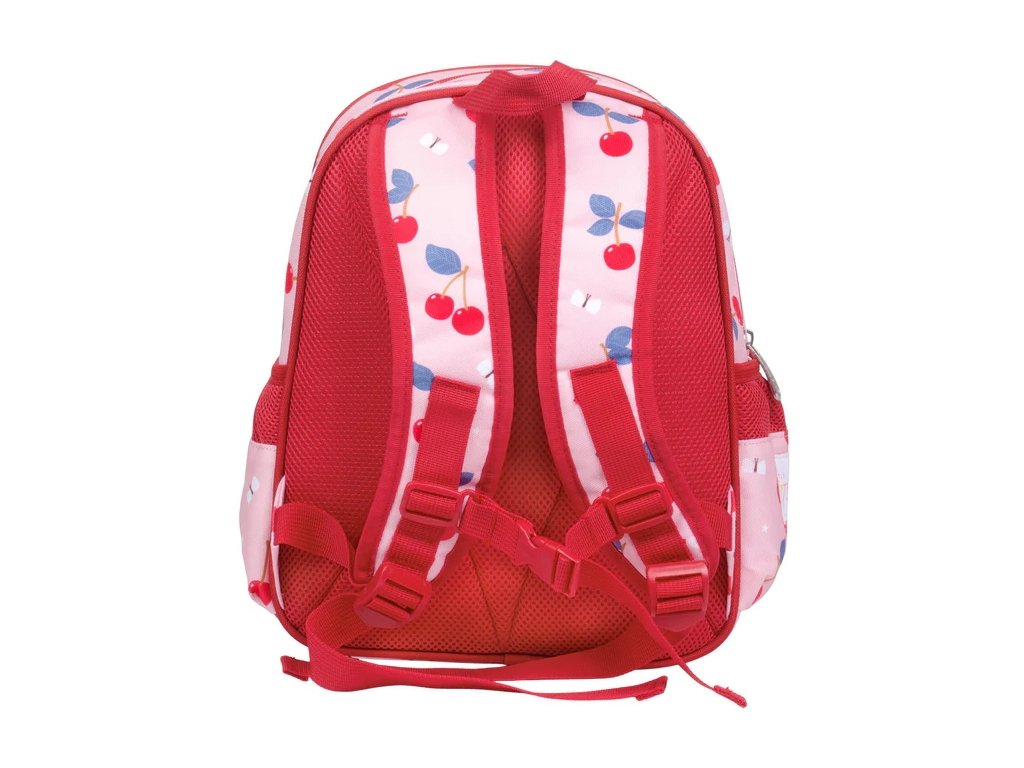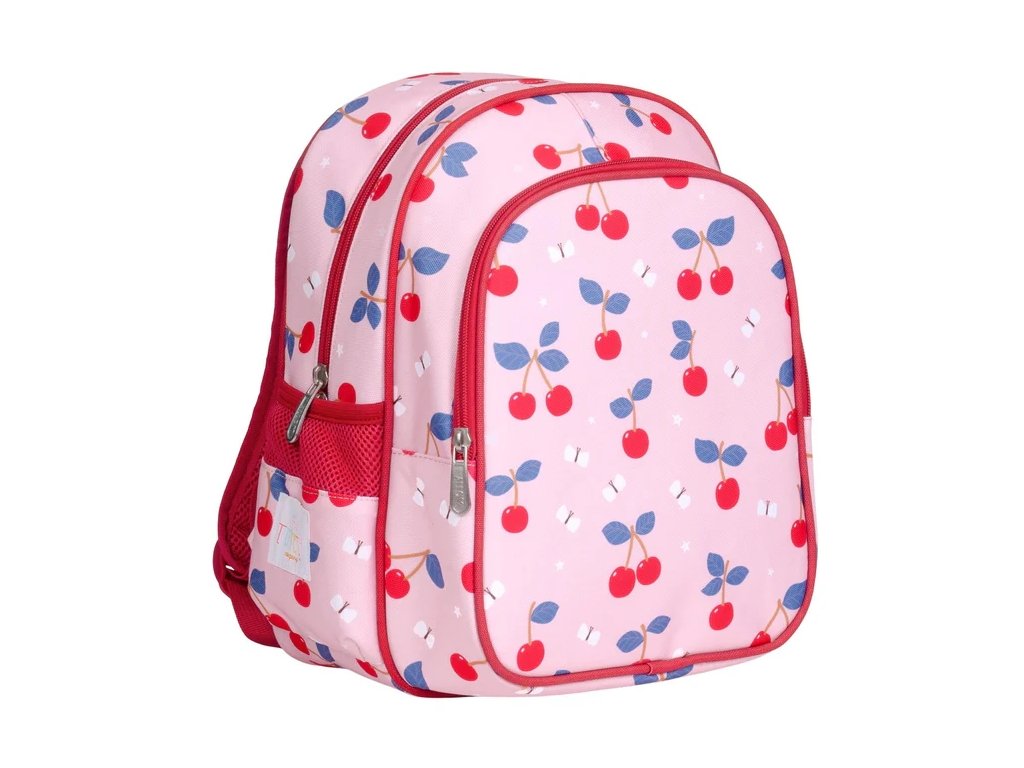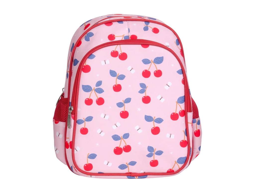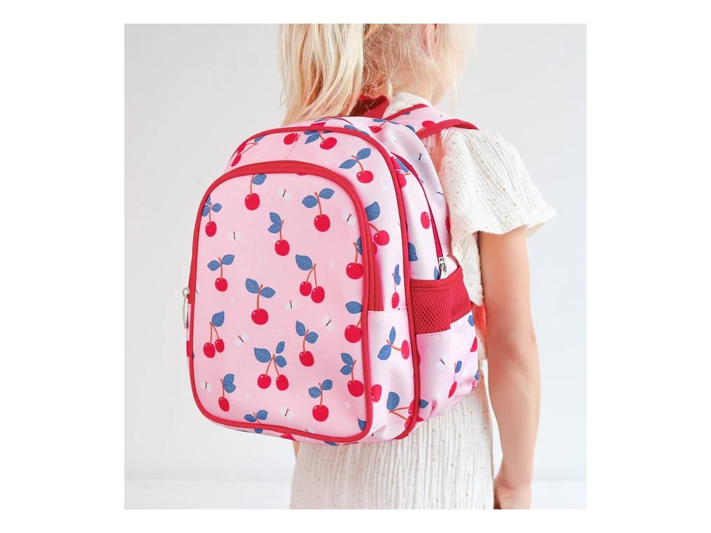 Acest rucsac elegant și practic, cu cireșe, este ideal pentru școală și excursii – poate să vă țină prânzul, o sticlă și toate comorile voastre! Curelele confortabile, cureaua pentru piept și spatele respirabil asigură un confort maxim în fiecare zi.