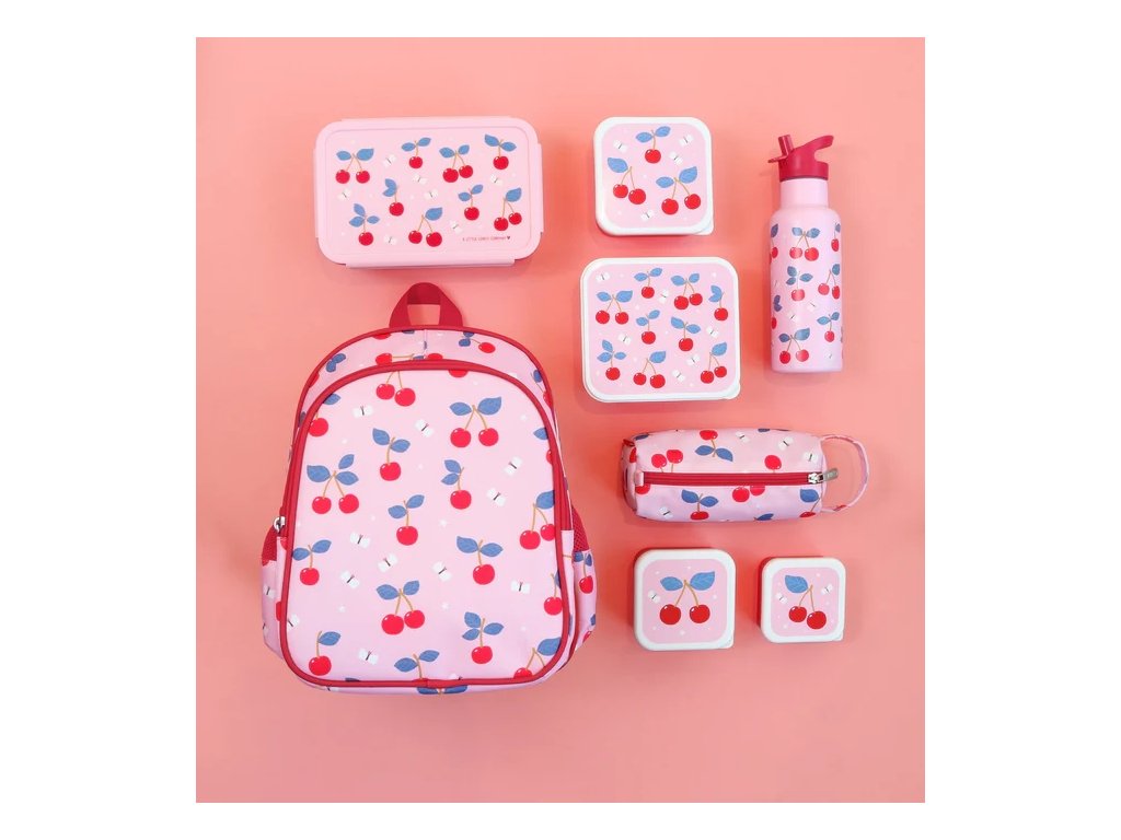 Asortează-ți trusa cu un penar, o sticlă și o cutie pentru prânz asortate – toate cu un design cu cireșe!