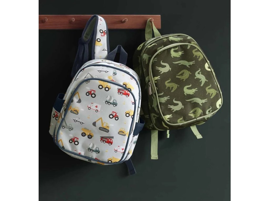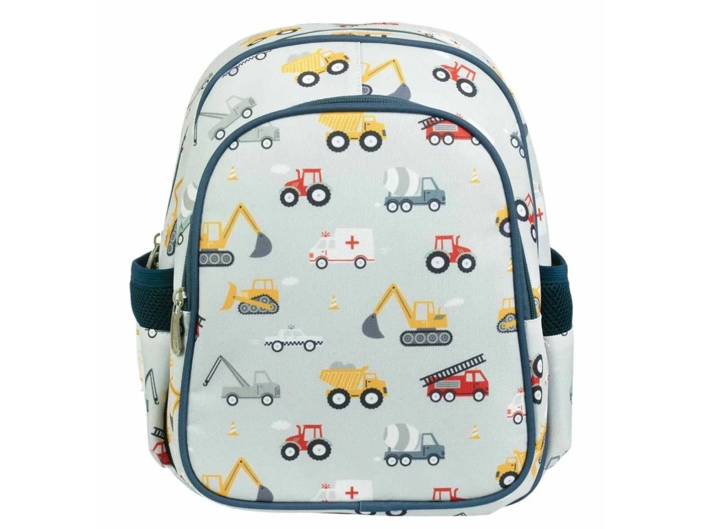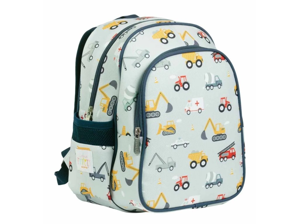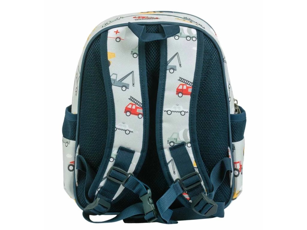 Rucsac elegant, de culoare albastru deschis, cu motiv vehicule este perfect pentru școală și excursii – spațios, cu un buzunar izolat și curele confortabile.