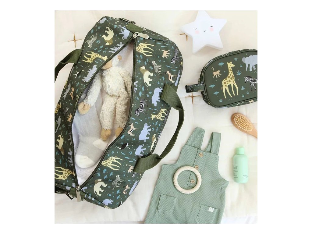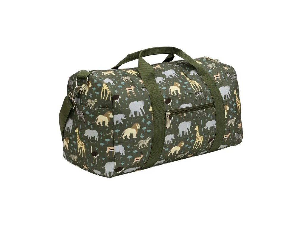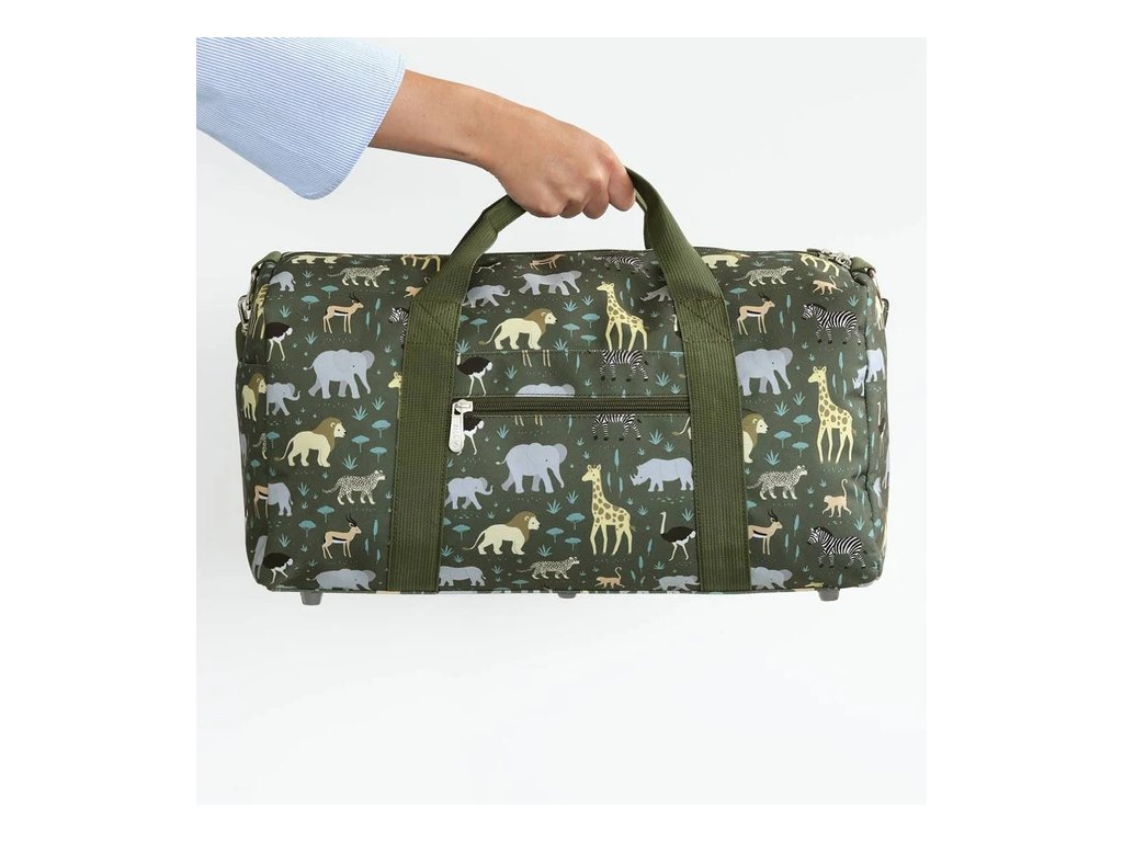 Această geantă de călătorie spațioasă, de culoare gri, cu animale din savană, este ideală pentru vacanțe, petreceri în pijamale sau ca geantă de sport. Geanta are nituri metalice în partea de jos, mânere duble și o curea de umăr reglabilă și detașabilă. Interiorul include un compartiment principal cu un buzunar suplimentar, două buzunare laterale și un buzunar frontal cu fermoar. Este potrivită și ca bagaj de mână (verificați întotdeauna regulile companiei aeriene respective).