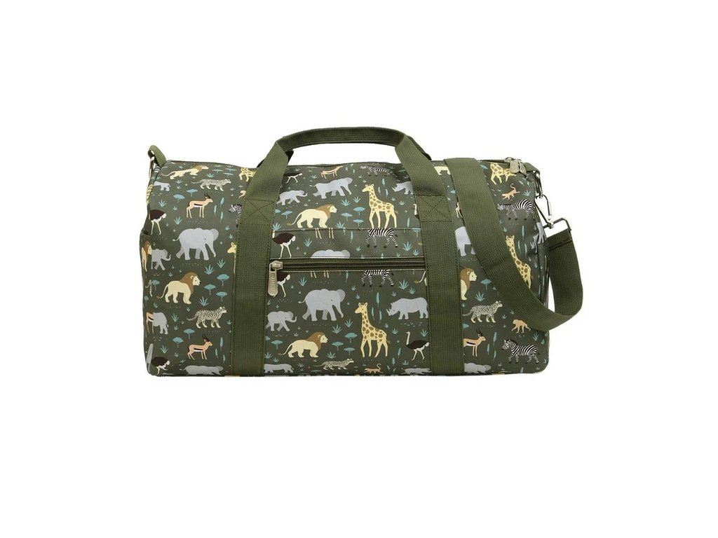Această geantă de călătorie gri, cu animale din savană, este ideală pentru vacanțe, sport sau petreceri în pijamale. ? Ușoară, spațioasă și practică – cu multiple buzunare și curea detașabilă.