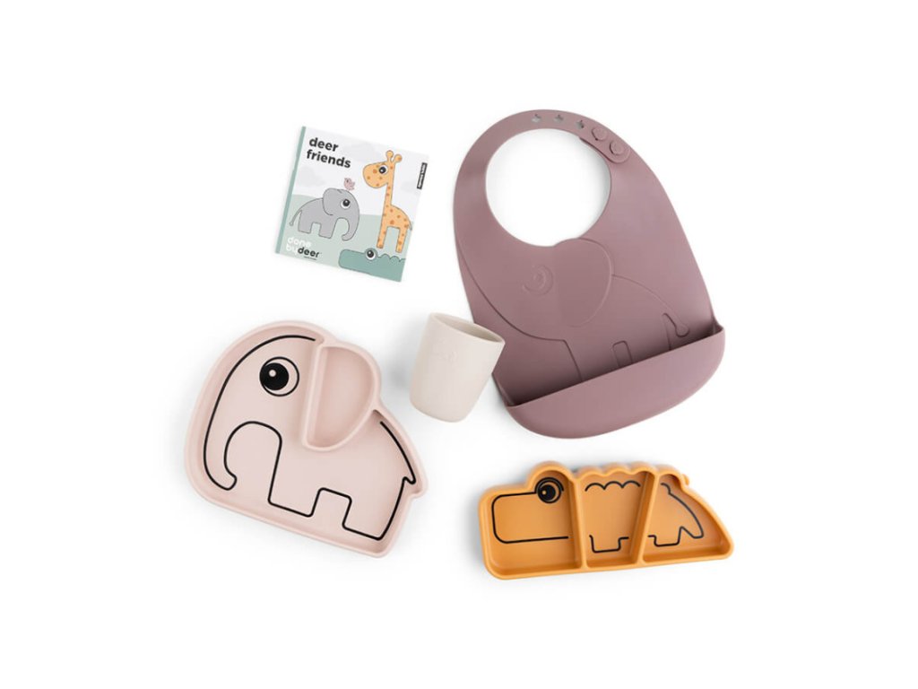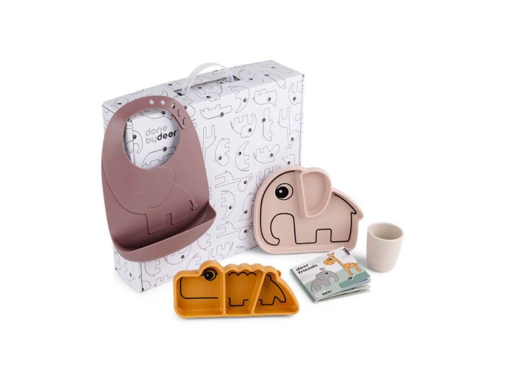 Setul cadou Stick & Stay conține un mix de patru bestsellere din colecția de veselă Done by Deer – farfurie din silicon Stick & Stay Elphee, farfurie pentru gustare Stick & Stay Croco, bavetă Peekaboo și mini-cănuță din silicon. Apăsați farfuria Stick & Stay pe suprafață, ventuza se lipește de majoritatea suprafețelor netede – prevenind astfel ca cei mici să împingă, să răstoarne sau să arunce vesela. Cutia robustă din carton este ideală pentru depozitarea lucrurilor copilului și conține și o broșură Deer Friends. Setul Stick & Stay include veselă din silicon în culorile albastru, verde și gri. Acest set cadou de început este o idee excelentă de dar. Vesela este rezistentă la spargere, potrivită pentru mașina de spălat vase, pentru utilizare la microunde, cuptor și congelator.