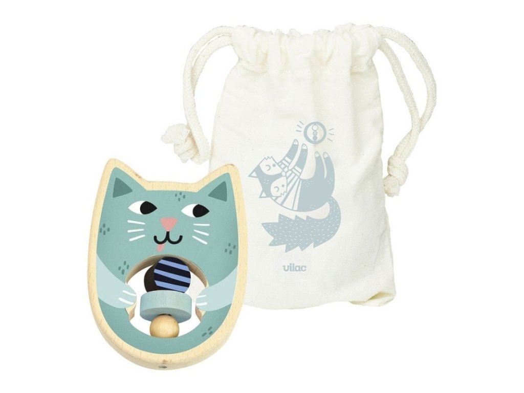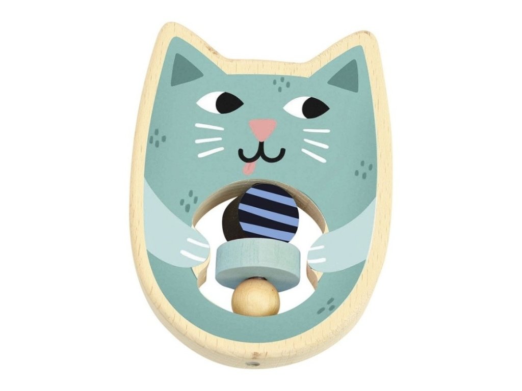 Zornăitoare din lemn frumoasă cu motiv de pisicuță, creată de designerița Michelle Carlslund. În mijloc se află 3 mărgele colorate care produc un sunet plăcut la scuturare. Jucăria este ambalată într-un săculeț textil și este potrivită și ca un cadou.