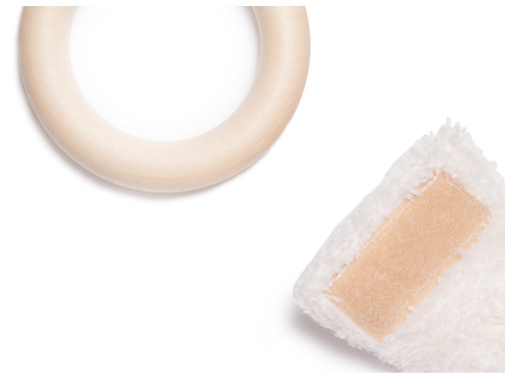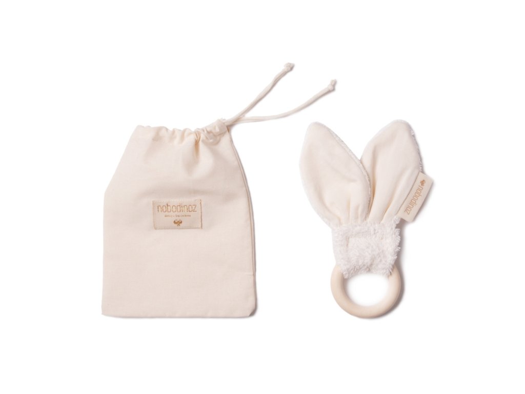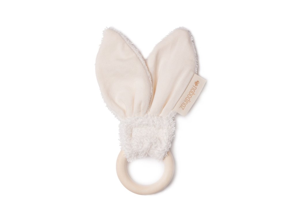 Drăgălașă jucărie de dentiție pentru copii cu inel din lemn și urechiușe de iepuraș.