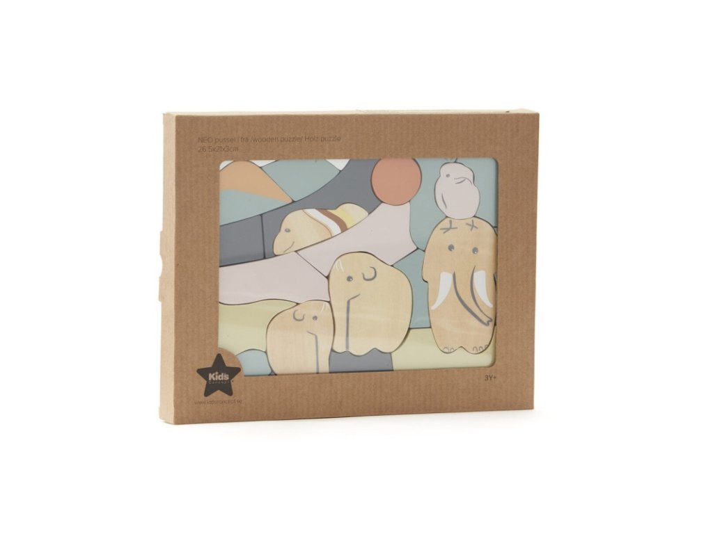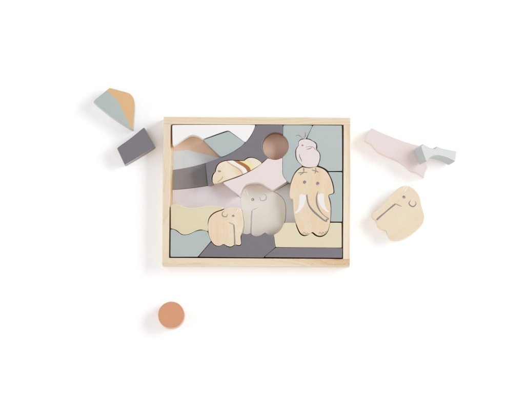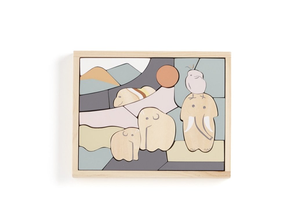 Puzzle din lemn pentru copii cu o bază cu un motiv drăguț de mamuți în culori pastelate. Piesele mari se îmbină perfect și au marginile rotunjite pentru o prindere mai ușoară. Pentru ca asamblarea să fie distractivă și pentru cei mai mici, puzzle-ul are motivul desenat pe bază, astfel încât imaginea să fie mai ușor de completat. Puzzle-ul îi ajută pe copii să dezvolte gândirea logică și să recunoască formele și culorile.