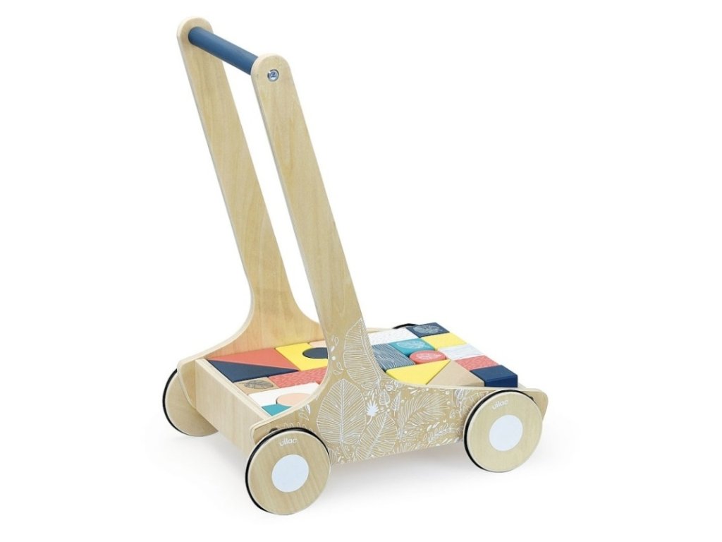 Această jucărie inteligentă și versatilă, sub forma unui cărucior din lemn, le va oferi copiilor dumneavoastră ore întregi de distracție. Căruciorul conține 24 de blocuri colorate care dezvoltă abilitățile motorii ale copiilor și recunoașterea culorilor și a formelor. În plus, poate servi și ca trotinetă, oferind copilului dvs. sprijin la mers.