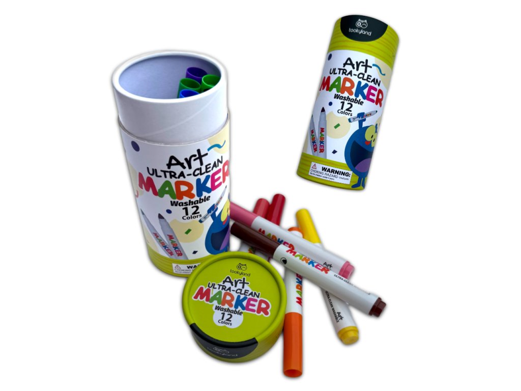 Aceste markere groase lavabile de la Tookyland, disponibile în 12 culori frumoase și intense, sunt concepute pentru a fi ușor de ținut și de desenat de către copii. Vârful special, mare și rotunjit, este ideal pentru începători, iar markerele nu pătează și nu trec prin hârtie – făcând desenul distractiv și motivând copiii să continue să creeze! Culori sigure, care se spală ușor Markerele sunt fabricate din materiale netoxice și sunt complet lavabile – culorile se pot spăla ușor de pe mâini, haine sau mese. Datorită cutiei cilindrice practice în care sunt depozitate markerele, copiii le pot lua cu ei peste tot și le pot strânge ușor după ce au desenat. Perfecte pentru micii artiști care descoperă lumea culorilor fără mizerie inutilă!Parametri suplimentari