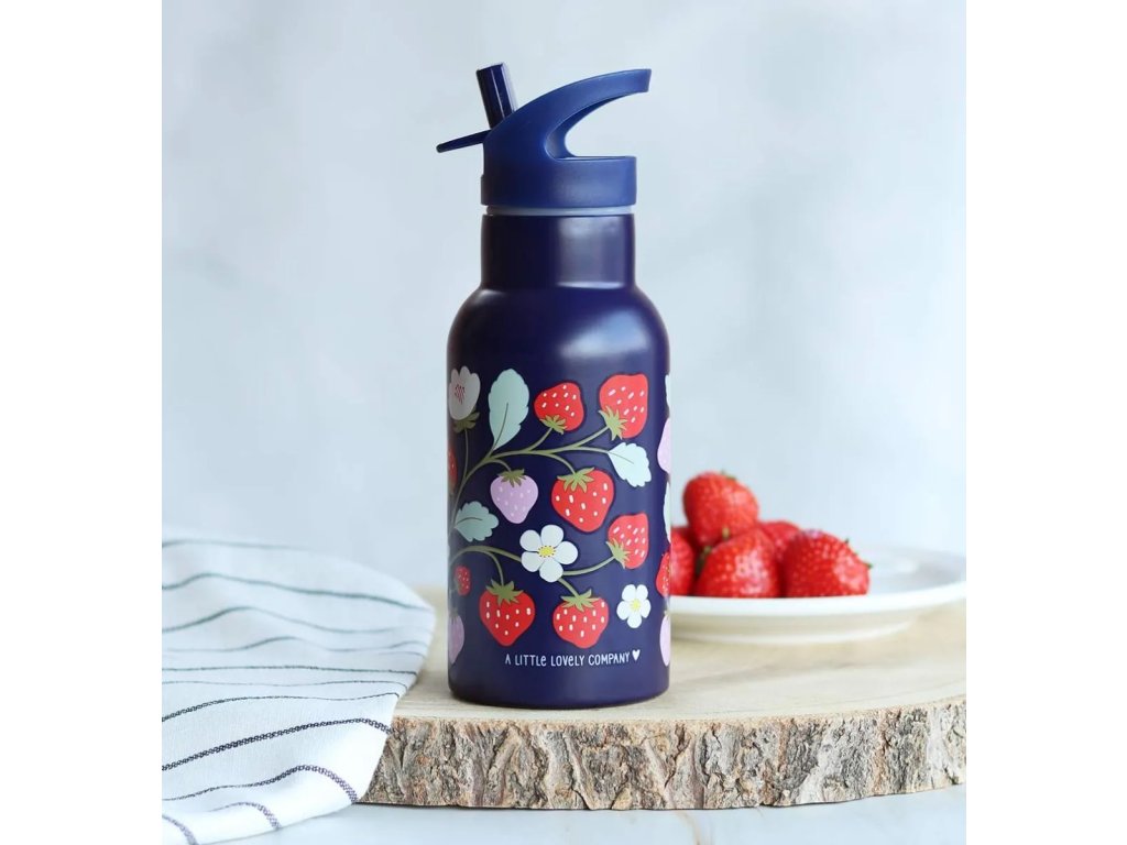 Această sticlă elegantă din oțel inoxidabil de culoare albastru închis, cu căpșuni, îți va păstra băutura rece pentru mult timp ?!