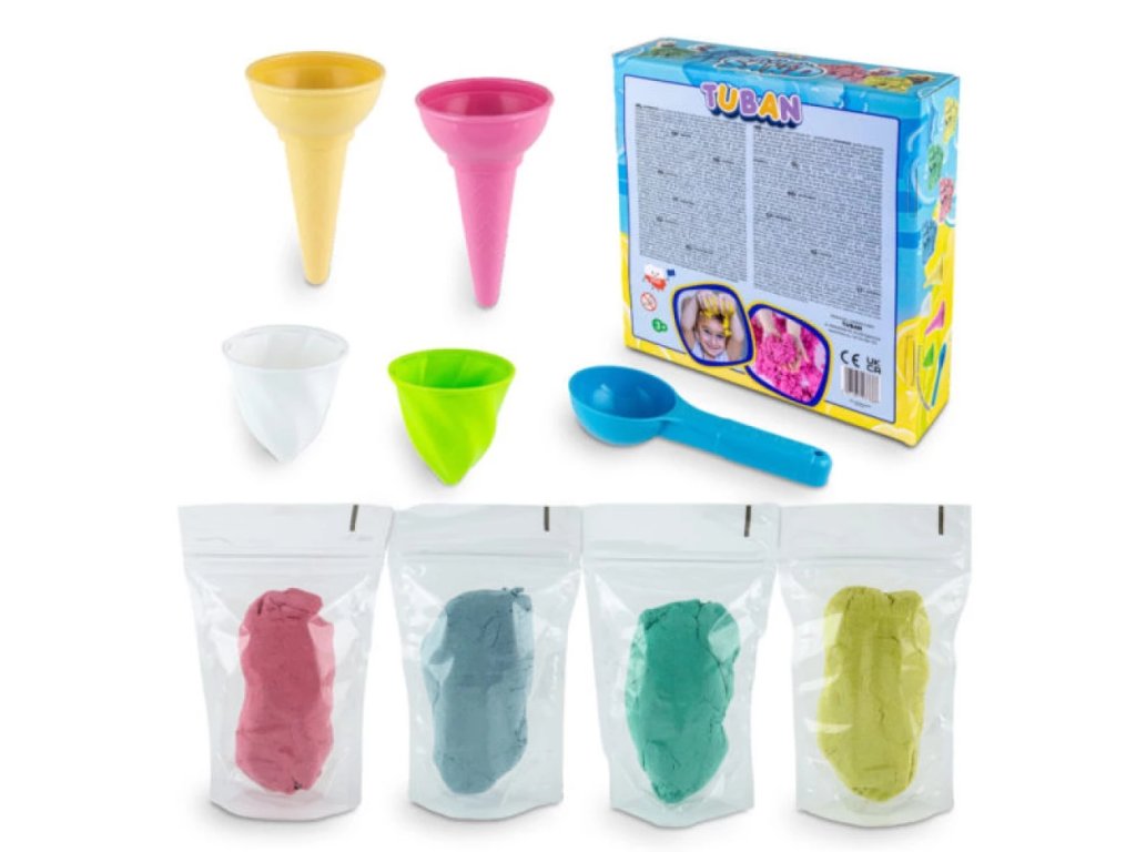 "Set de înghețată cu nisip pufos cu aromă de gumă de mestecat – creați înghețate parfumate și colorate care vor stimula imaginația copilului dumneavoastră! Jocul creativ perfect care promovează abilitățile motorii fine și experiența senzorială."