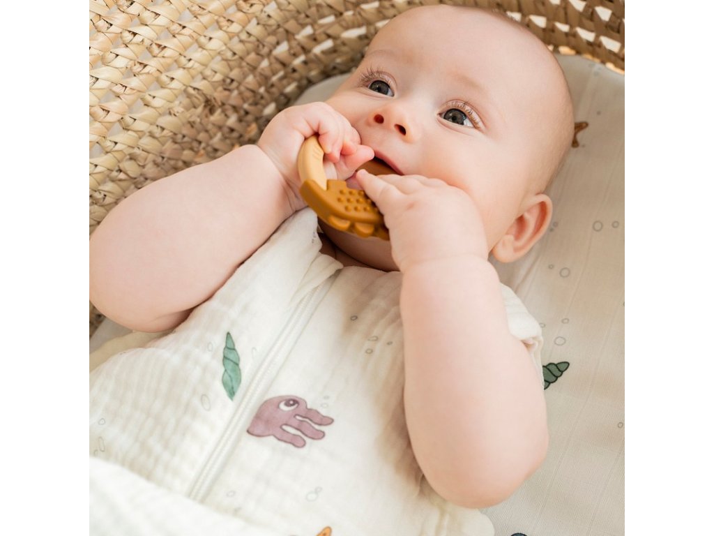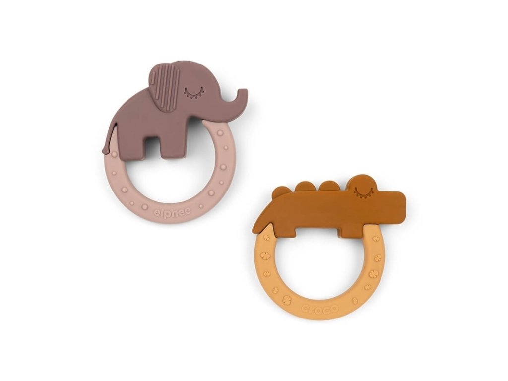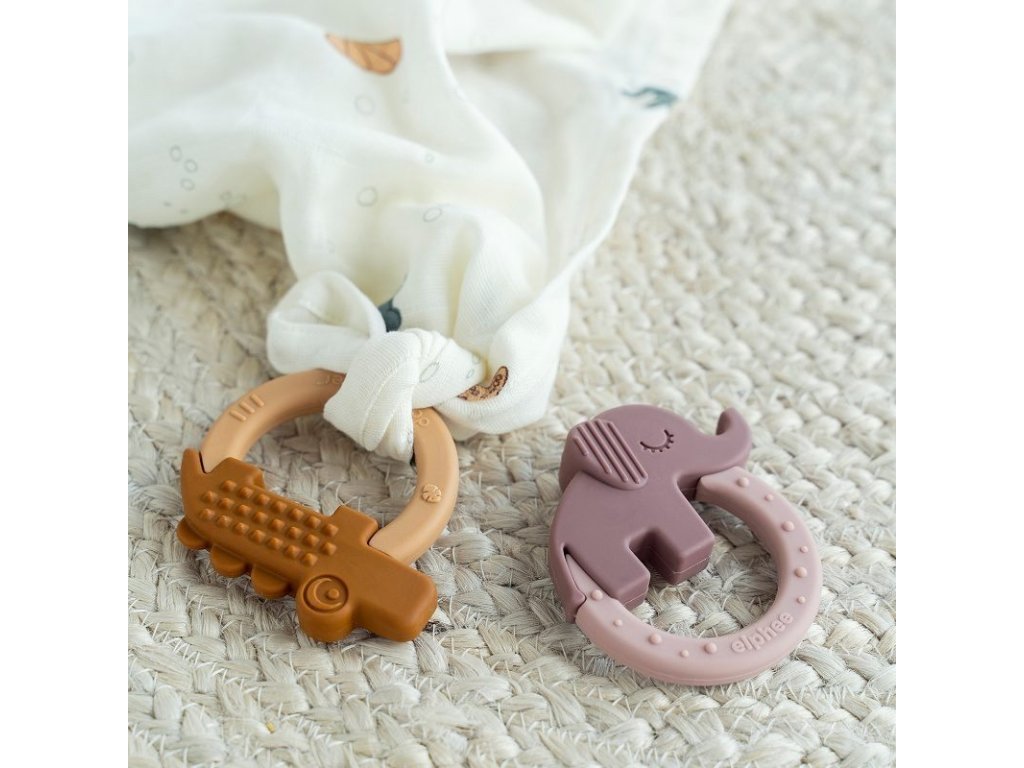 Set de două jucării de dentiție din silicon moale în formă de Croc și Elphee. Jucăriile sunt ușor de ținut în mâinile mici, iar formele și texturile diferite ajută la stimularea și calmarea gingiilor iritate atunci când apar primii dinți.