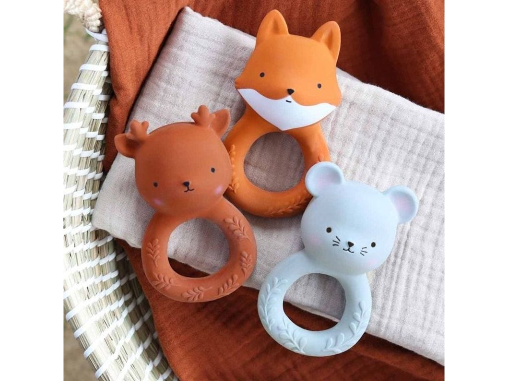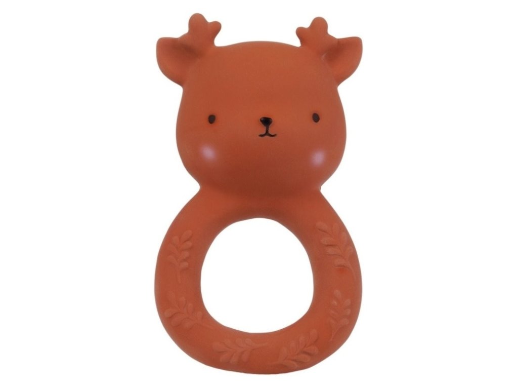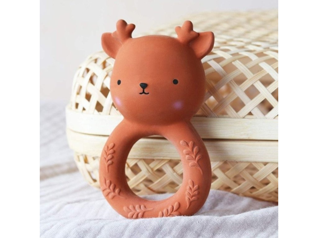 Acest jucărie de dentiție din teracotă în formă de cerb prietenos este fabricată din cauciuc natural și oferă alinare în timpul dentiției. Este moale, ușor de ținut și sigur pentru gurițele micuțe. Curățarea este foarte ușoară – ștergeți-l cu o cârpă și apă cu săpun.