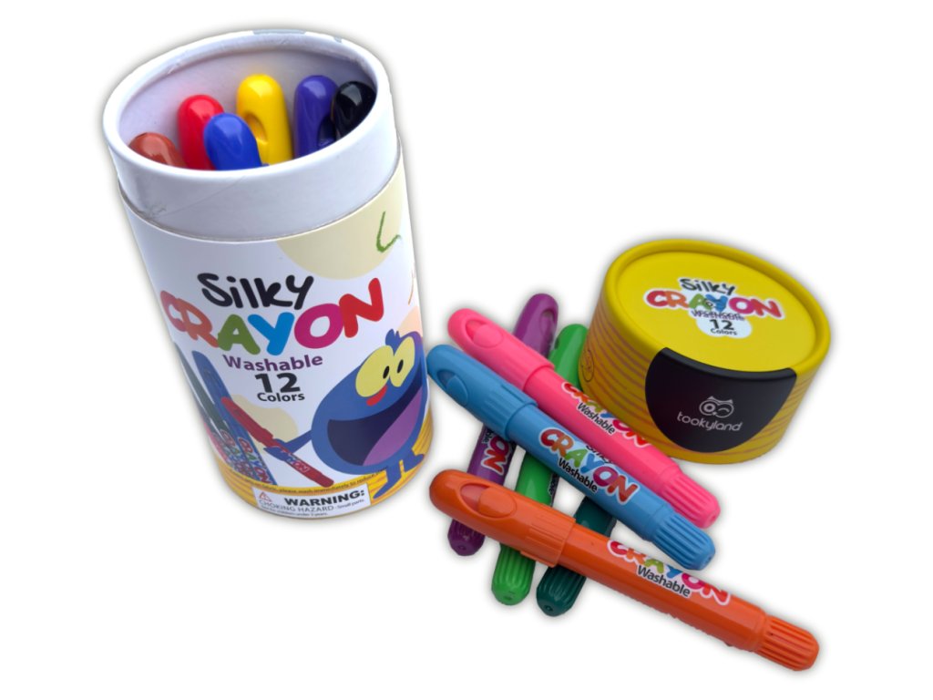 Un set de 12 creioane moi care se spală ușor de pe piele și haine. O simplă atingere ușoară și desenul devine un joc plin de culoare și bucurie!"