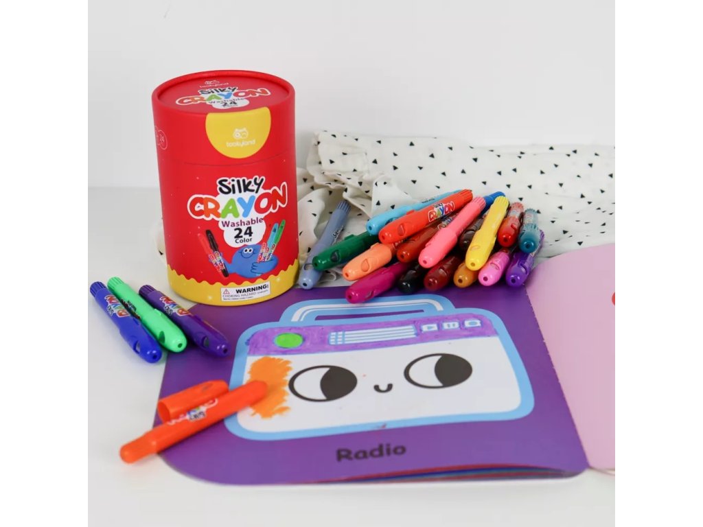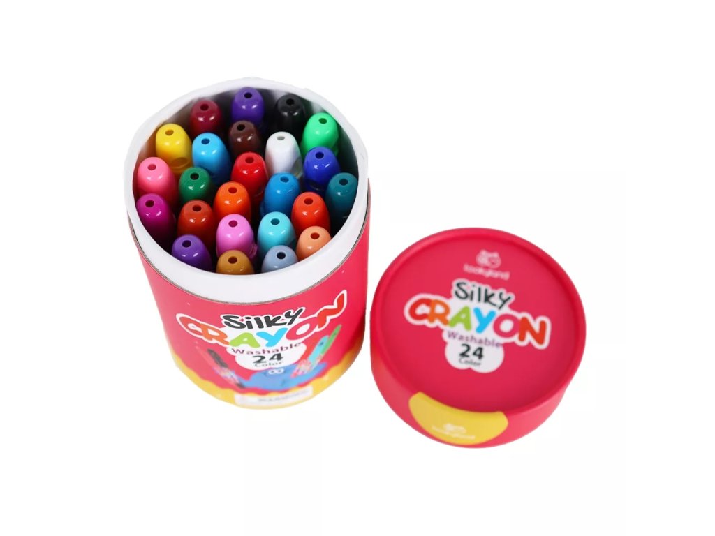 "Creioane moi lavabile în 24 de culori frumoase – ideale pentru desen pe hârtie și pictură pe față! Se scot ușor, nu se rup și lasă culori intense fără efort."
