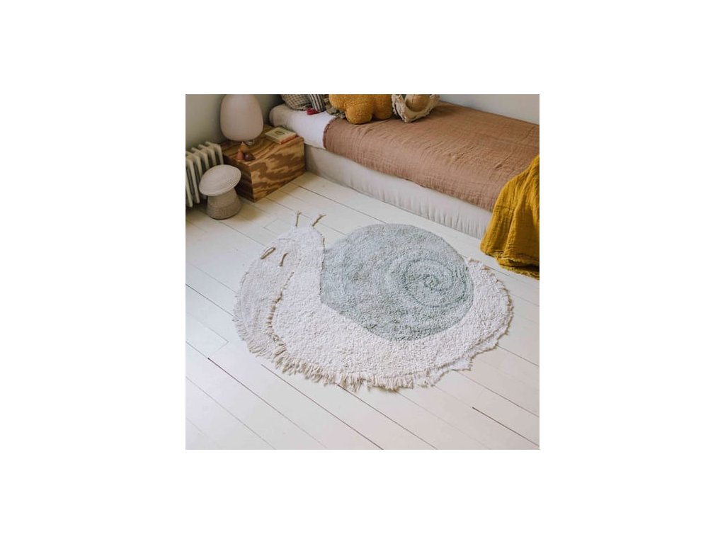 Explorați colecția noastră de covoare cu animale și alegeți covorul preferat! Noul covor lavabil Snail are o cochilie rotundă în nuanțe delicate de albastru și verde din bumbac, care imită spirala unui melc. Este înconjurat de un corp de culoare naturală, cu franjuri tăiate manual și finisat cu împletituri realizate manual, care servesc drept antene. Transformați orice spațiu într-o grădină magică cu covorul nostru în formă de melc!