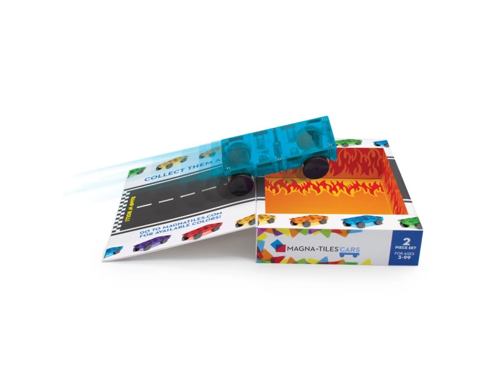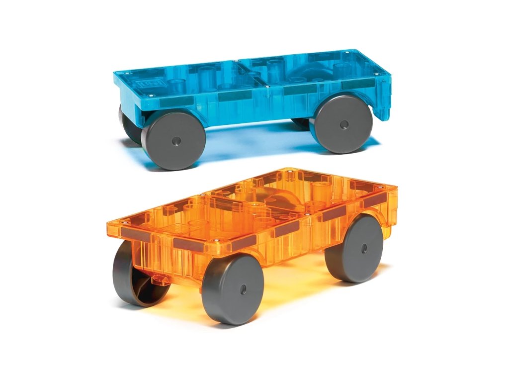 "Magna-Tiles® Cars ? le permite copiilor să-și proiecteze propriile vehicule cu două șasiuri magnetice în culorile albastru și portocaliu.