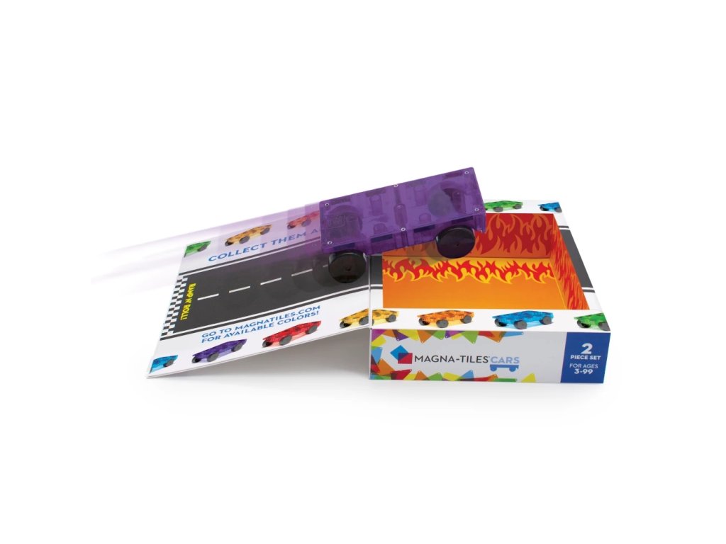 "Magna-Tiles® Cars Purple/Red ? permite copiilor să-și proiecteze propriile vehicule cu două șasiuri magnetice în culorile violet și roșu.