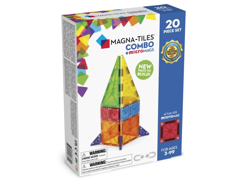 "Setul de construcție magnetic MAGNA-TILES Combo de 20 de piese combină piese clasice și microMAGS mai mici pentru posibilități creative nelimitate.