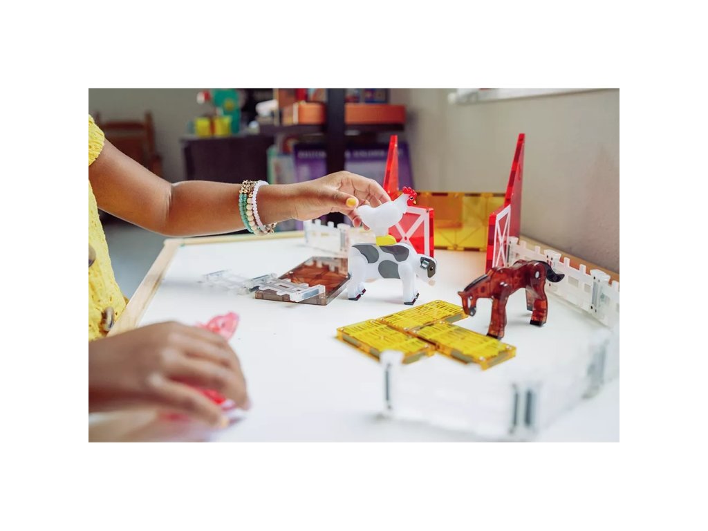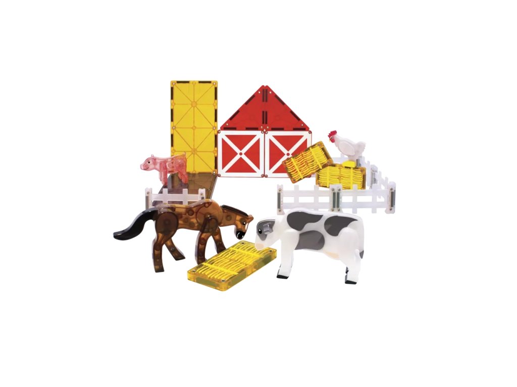 Setul magnetic de construcție fermă aduce distracție cu animale de fermă, un hambar și primul gard magnetic! Dezvoltați creativitatea și abilitățile motorii ale copiilor cu acest set unic, plin de aventuri la fermă. ?"