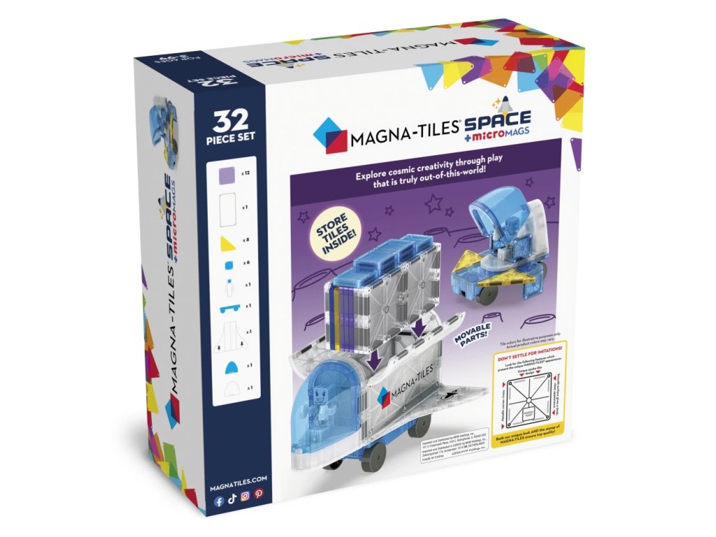 Cu MAGNA-TILES Space, copiii pot construi propria stație spațială, pot descoperi posibilități creative nelimitate și se pot aventura într-o misiune fantastică în spațiu! Acest set unic conține 32 de piese, inclusiv o navetă spațială cu spațiu de depozitare, o capsulă spațială și figurine de astronauți, care dezvoltă creativitatea, gândirea logică și abilitățile motorii fine ale copiilor.