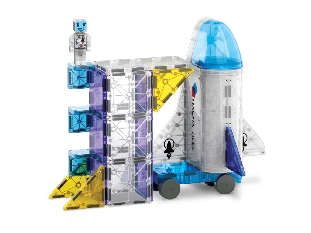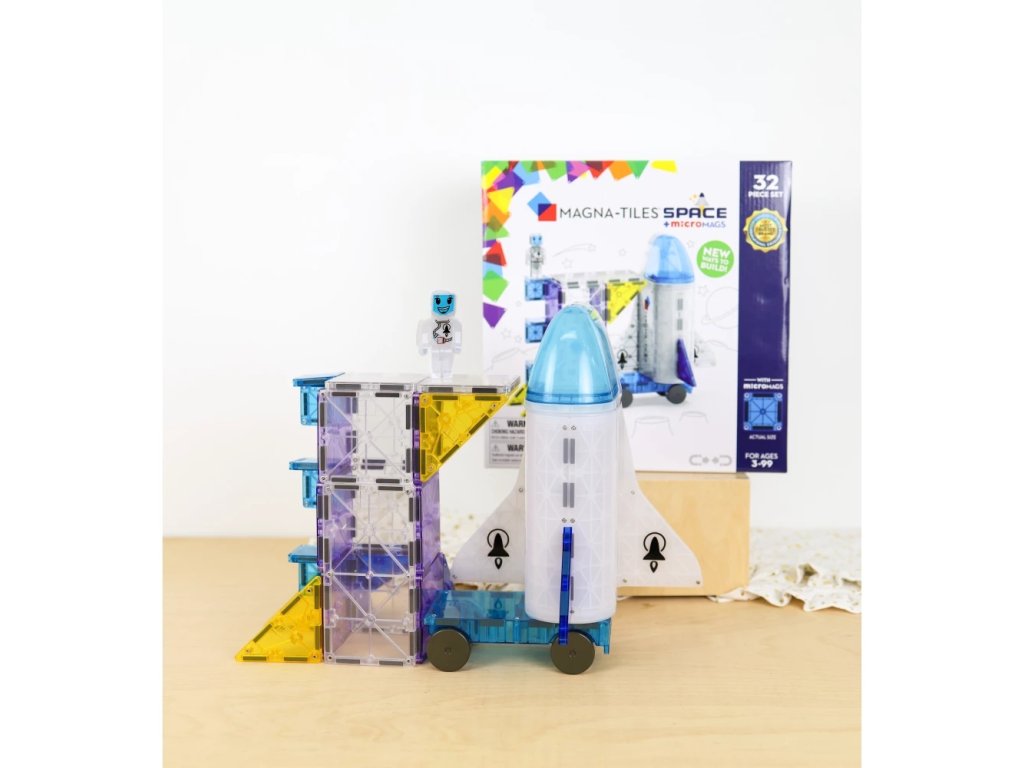 "Setul de construcție magnetic Space le permite copiilor să-și construiască propria stație spațială cu o rachetă, o capsulă și o figurină de astronaut!