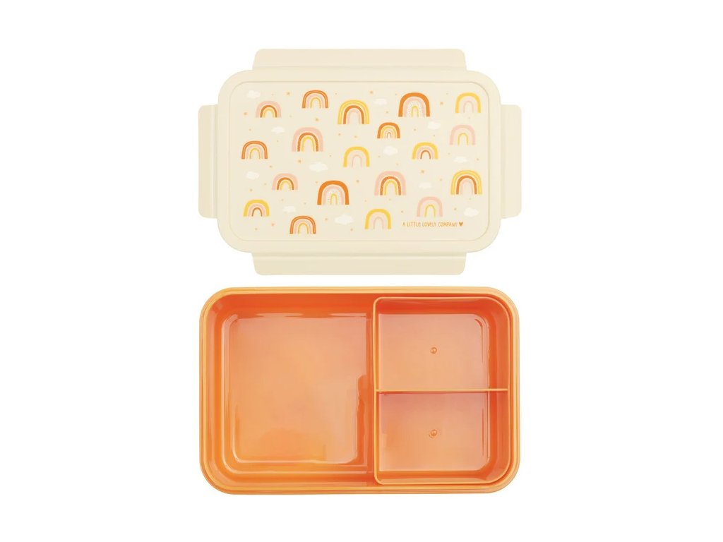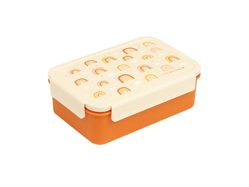 Această cutie bento portocalie spațioasă, cu un motiv vesel în culorile curcubeului este perfectă pentru un prânz gustos și colorat la școală sau în excursii. Capacul etanș Click & Close păstrează alimentele proaspete, iar compartimentul bento cu două secțiuni vă ajută să vă păstrați prânzul în ordine.