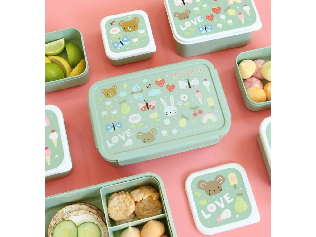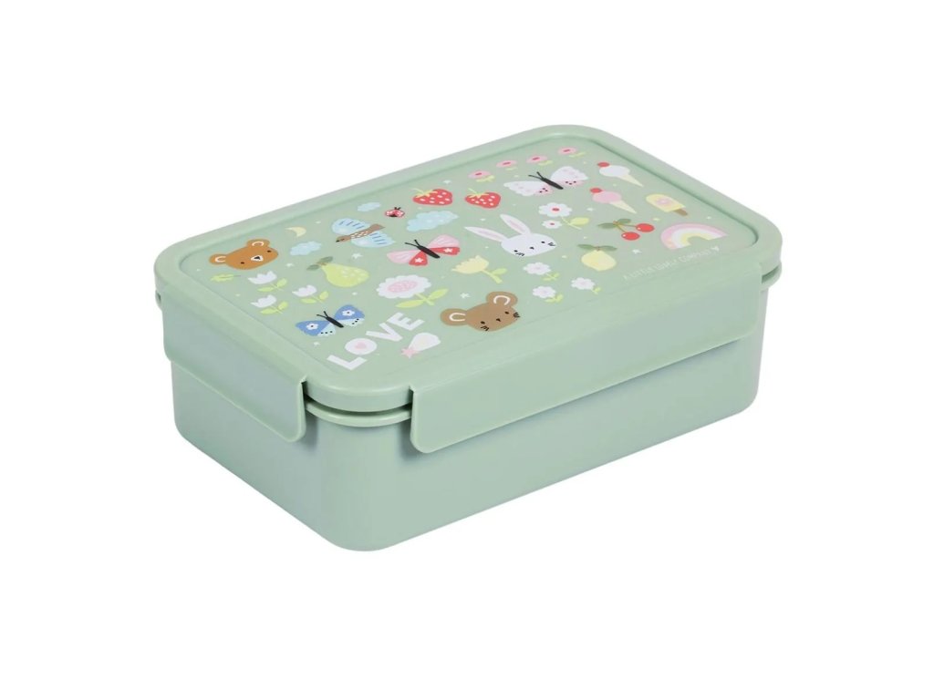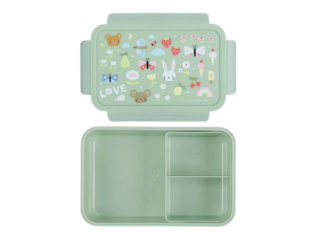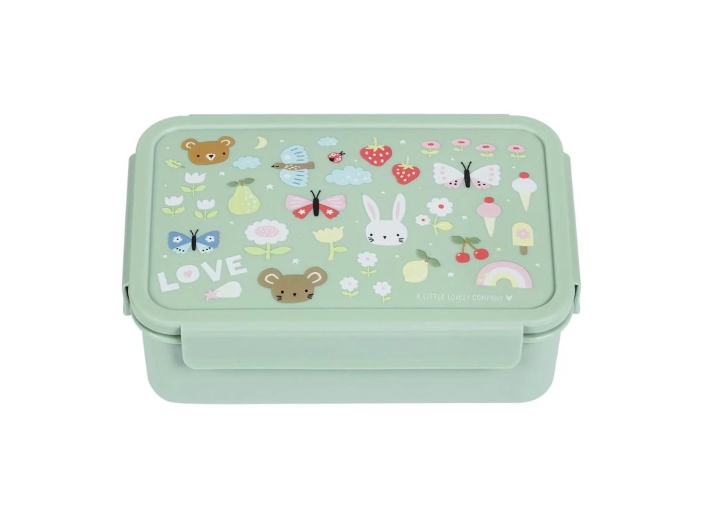 Această cutie elegantă pentru prânz, de culoare verde mentă, cu fluturi, căpșuni și iepurași drăguți, vă va păstra prânzul proaspăt și perfect organizat. Datorită capacului etanș și compartimentului practic, este ideală pentru școală și călătorii! ?