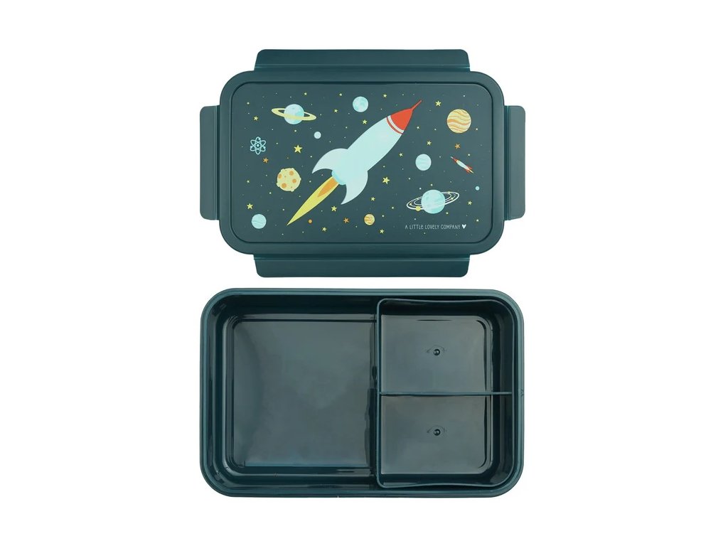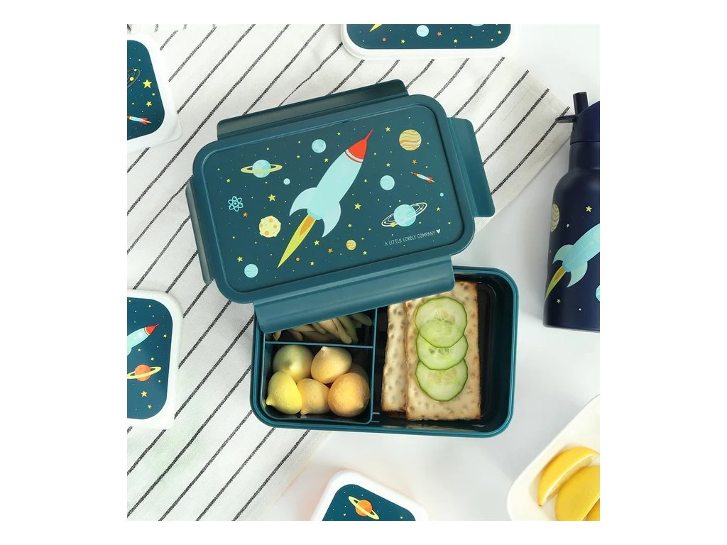 Această cutie bento elegantă, de culoare albastru închis, cu tematică spațială, vă va păstra prânzul proaspăt și perfect organizat, datorită capacului etanș și compartimentului practic pentru bento.
