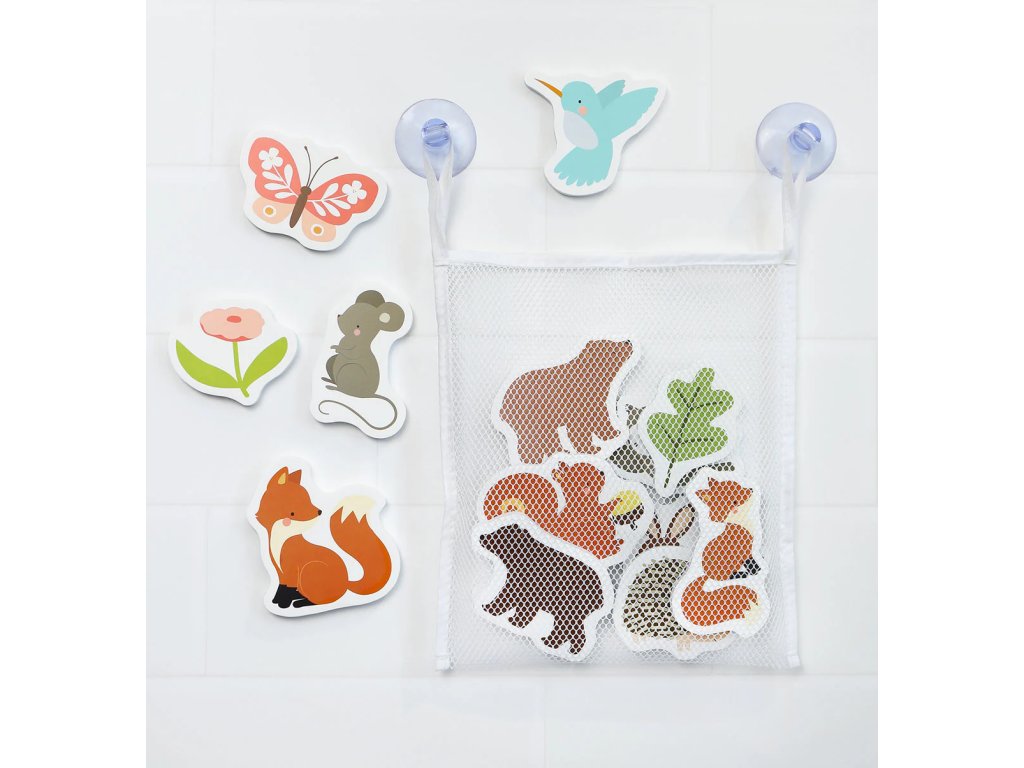 Baie plină de aventuri cu prietenii din pădure! Aceste jucării drăguțe din spumă pentru baie vor aduce distracție fără sfârșit celor mici. Cele 14 piese colorate se lipesc ușor de peretele dușului sau de gresie când sunt ude, iar după baie, le puteți depozita rapid în plasa cu ventuze inclusă. Jucăriile nu absorb apa, fiind ușor de curățat, se usucă rapid și împiedică formarea mucegaiului. ?