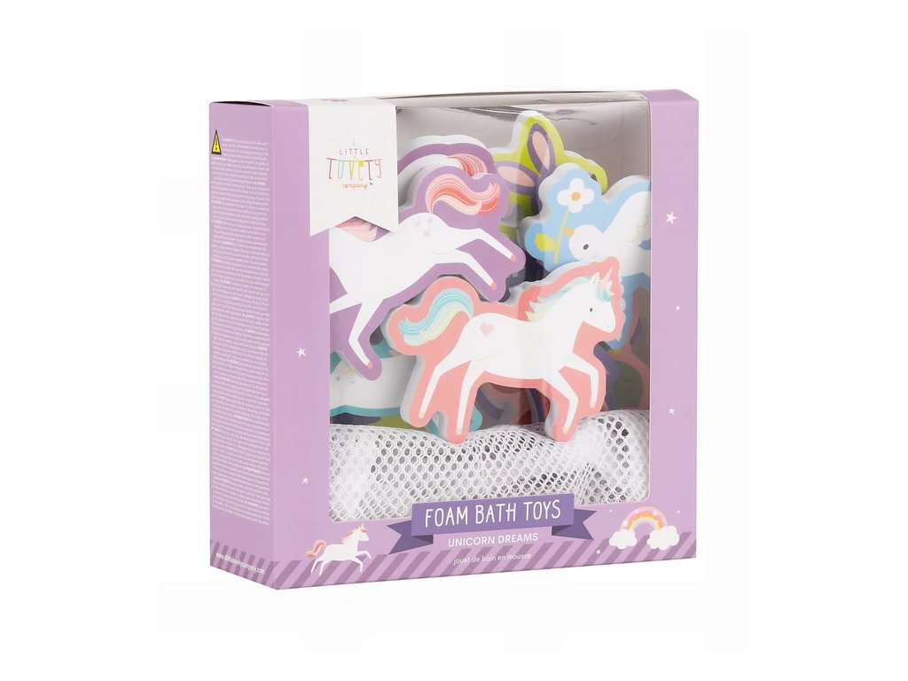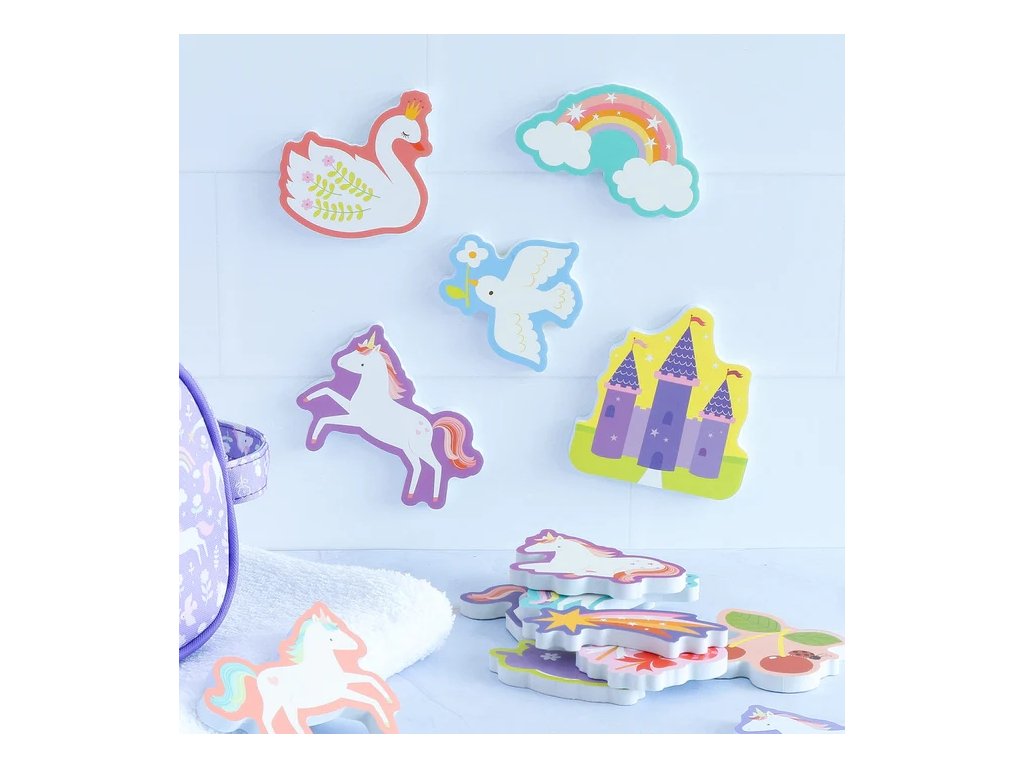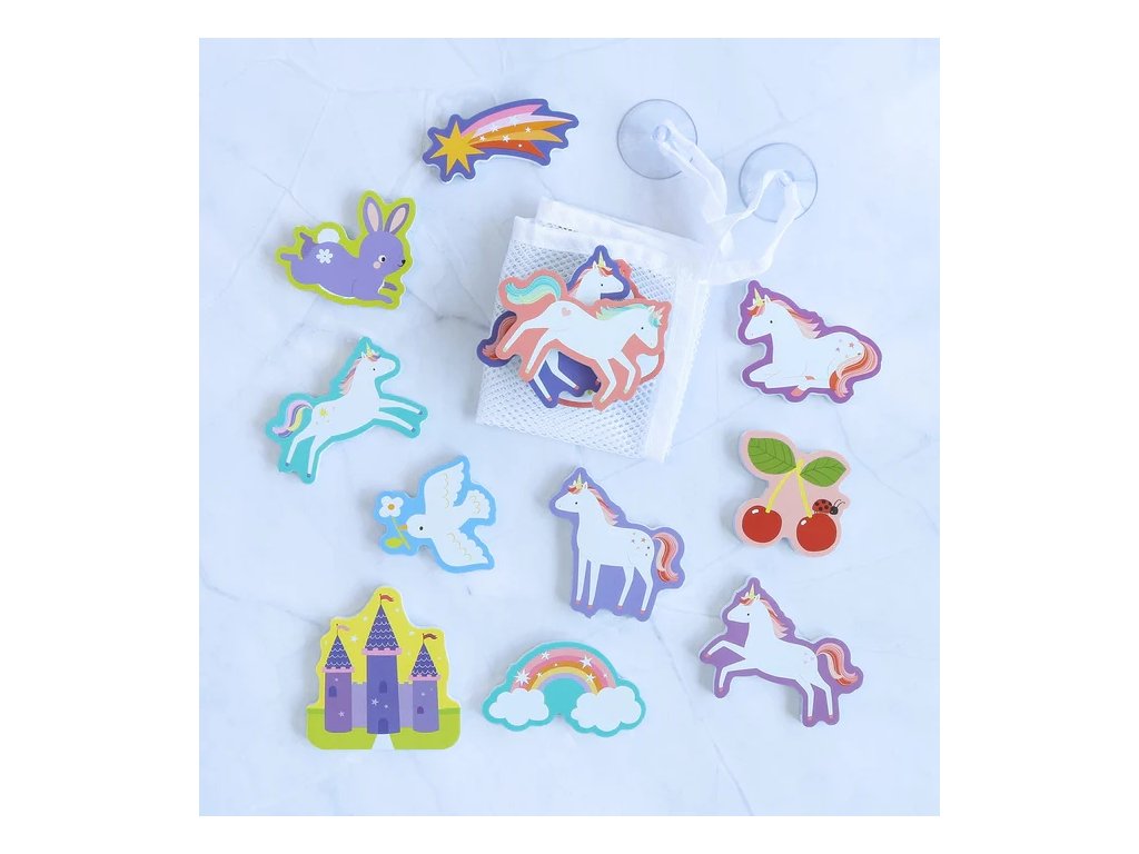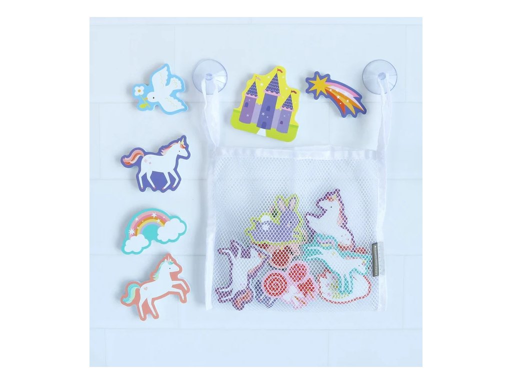 Distracție magică în baie cu jucăriile din spumă în formă de unicorn! Cele 14 piese colorate se lipesc de gresie când sunt ude și pot fi depozitate într-o plasă practică cu ventuze după baie. ?
