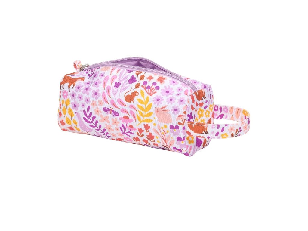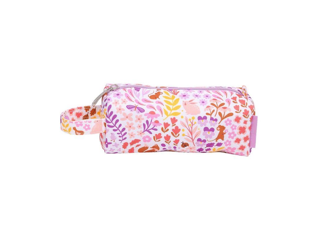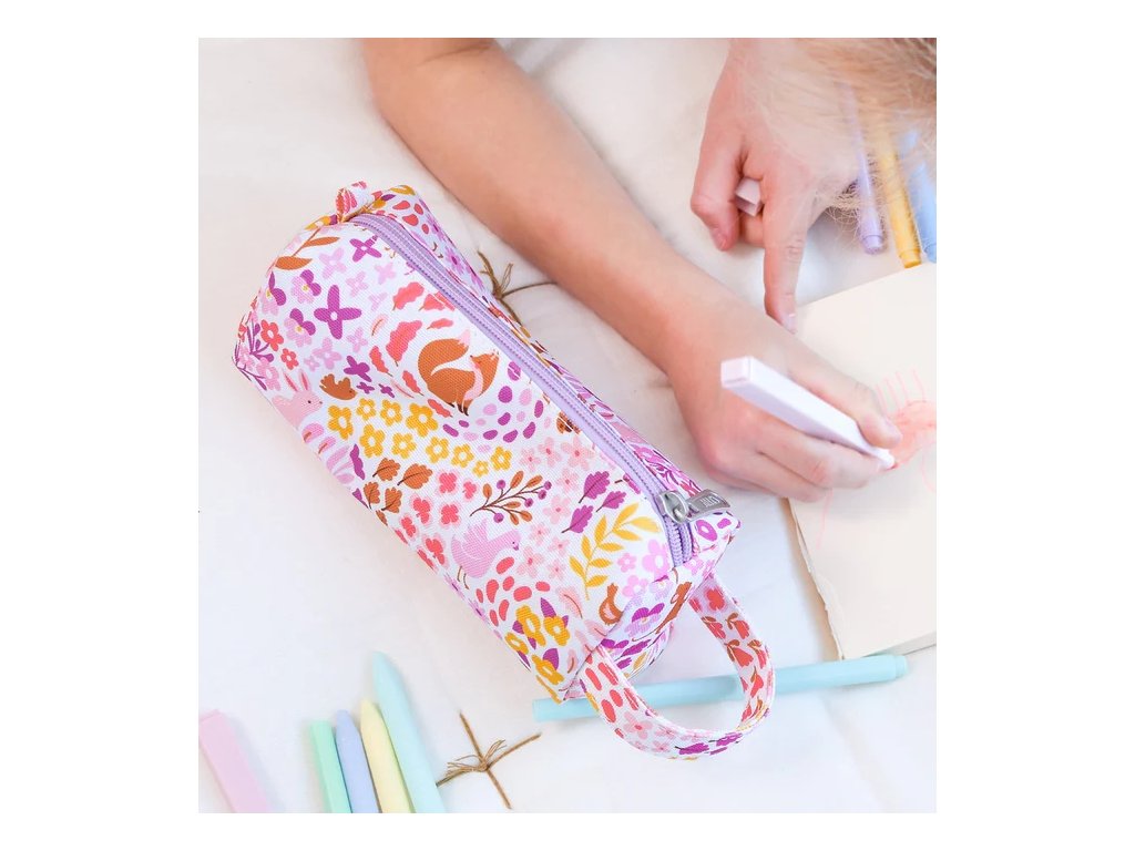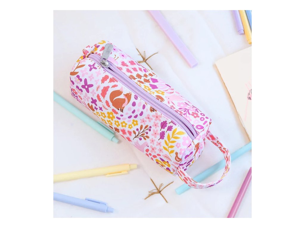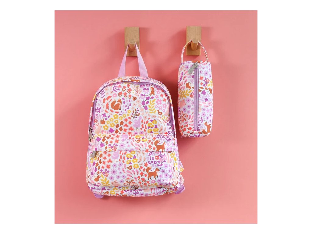 Acest penar violet cu flori și vulpi adorabile este perfect pentru școală! Datorită căptușelii și buclei sale, este practic, elegant și mereu la îndemână.