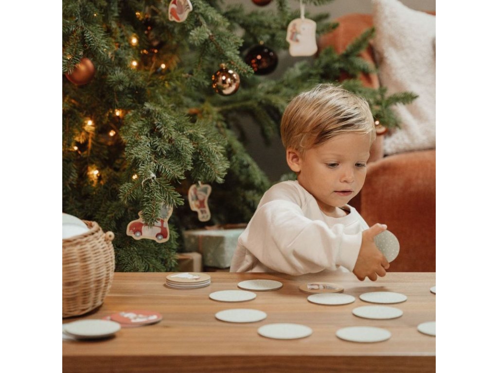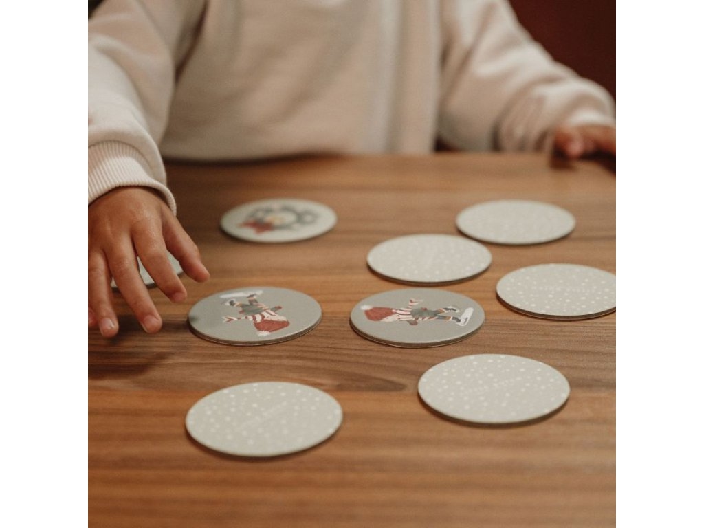 Acest joc simplu este atât distractiv, cât și educativ. Cărțile rotunde prezintă ilustrații frumoase cu tematică de iarnă, de la oameni de zăpadă la reni. Amestecați bine cărțile și așezați-le cu fața în jos pe masă. Acest joc ajută la dezvoltarea unor abilități importante, precum concentrarea și atenția.