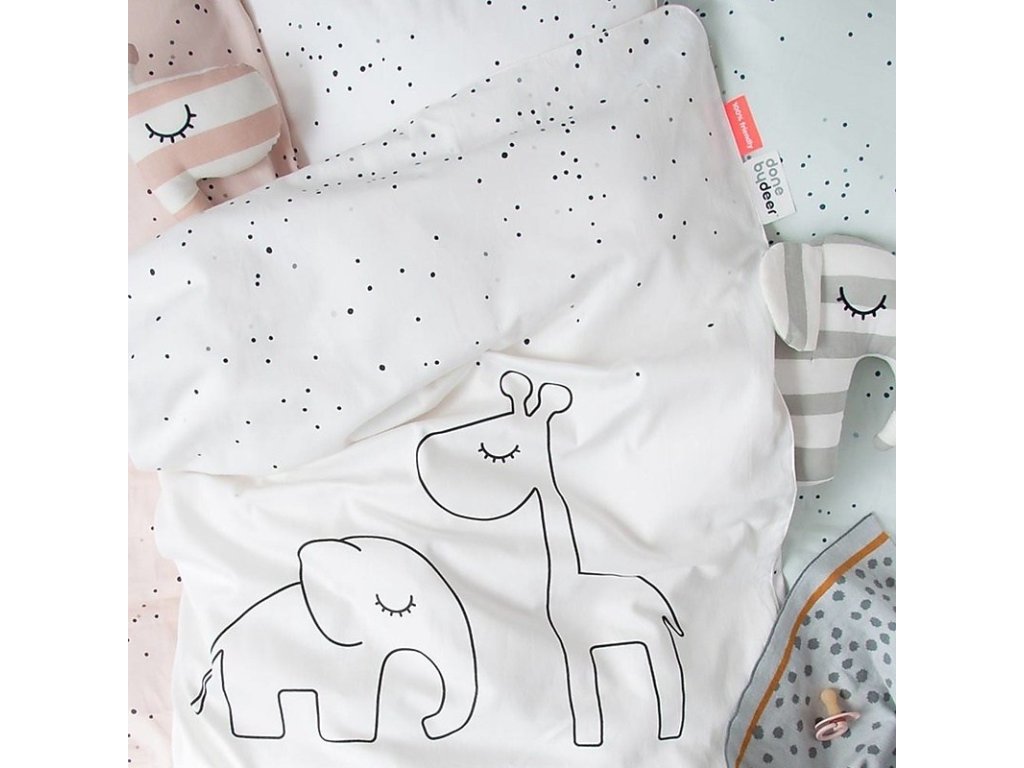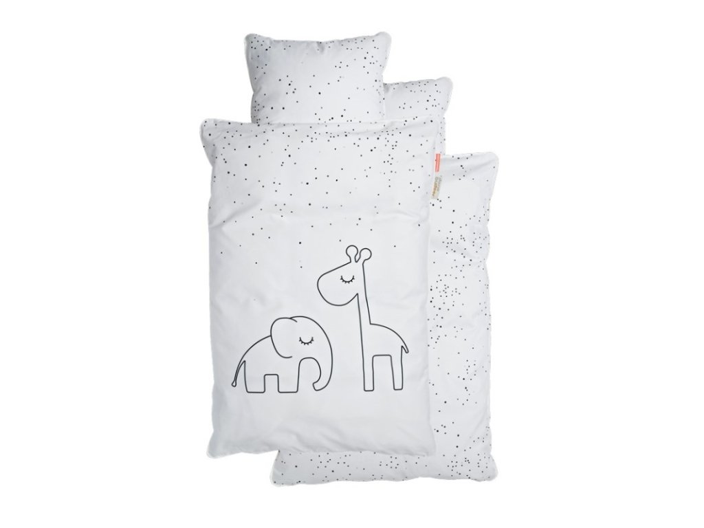 Lenjerie de pat pentru copii din colecția Dreamy Dots. Cearșafurile sunt albe cu puncte negre și o imagine cu Elphee, elefantul adormit, și Raffi, girafa. Animalele vor veghea asupra comorilor tale adormite, iar această lenjerie de pat va fi un plus minunat pentru patul copilului tău.
