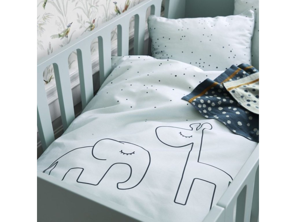 Lenjerie de pat pentru bebeluși din colecția Dreamy Dots. Husele sunt într-o nuanță delicată de albastru pastel cu puncte negre și imaginea elefănțelului adormit Elphee și a girafei Raffi. Animăluțele vor veghea somnul micuțului dumneavoastră, iar această lenjerie va fi, în plus, un accesoriu minunat pentru pătuțul copilului.