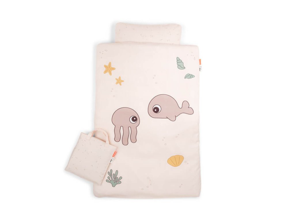 Lenjeria de pat pentru copii Jelly & Wally fabricată din bumbac organic certificat GOTS este moale și confortabilă. Creați un mediu confortabil pentru somn cu imprimeul jucăuș Jelly & Wally și lăsați-vă micuțul să se cufunde în vise liniștite cu oceanul. Lenjeria de pat pentru copii Jelly & Wally pentru copii are un fermoar practic YKK de siguranță atât la fața de pernă, cât și la husa de plapumă. Lenjeria de pat este ambalată într-o pungă mică din bumbac, ideală pentru jucării, haine sau alte utilizări practice. Lenjeria are o nuanță pudrată, cu elemente din viața oceanului, precum scoici, recife de corali, stele de mare și doi prieteni ai mării, Jelly și Wally, în nuanțe delicate. Partea din spate este decorată cu un imprimeu drăguț cu bule, care se asortează cu punga.