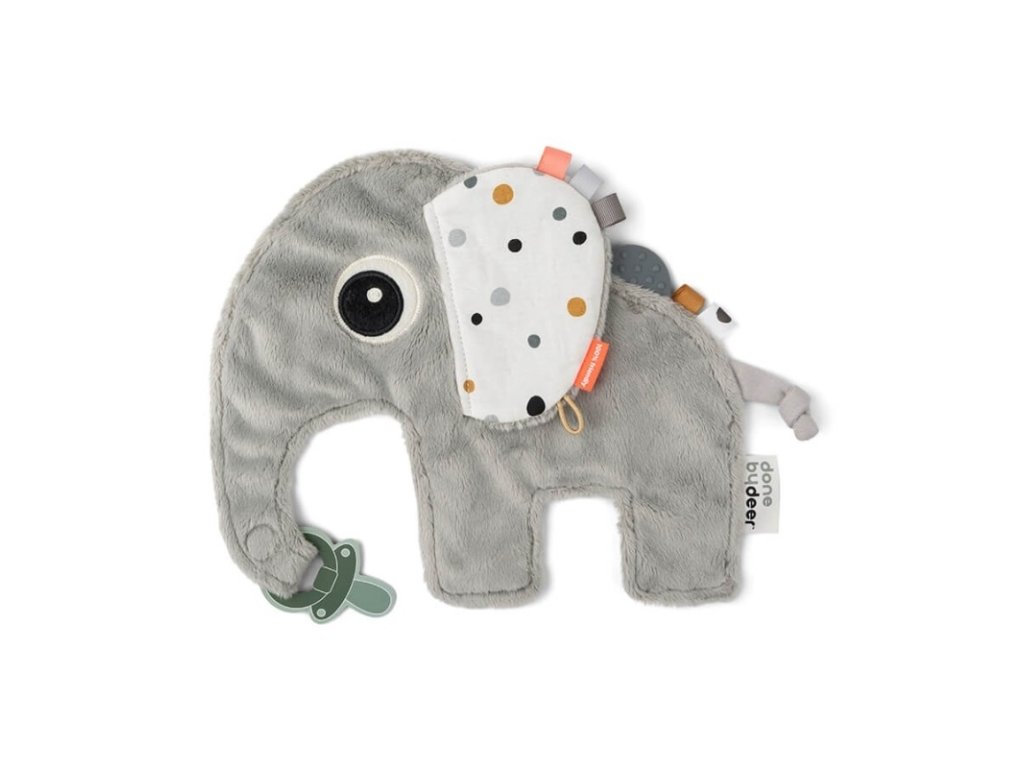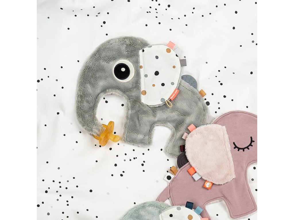 Bebelușului tău îi va plăcea să se cuibărească în brațele moi ale jucăriei în formă de elefant Elphee. Degetele mici pot apuca cu ușurință trompa lungă și se pot distra explorând etichetele colorate, texturile și formele diferite. Jucăria moale din silicon calmează gingiile iritate. O curea practică cu velcro și o buclă elastică vă permit să atașați suzeta bebelușului, astfel încât simpaticul elefant să o poată păzi cu atenție în timp ce bebelușul adormește.