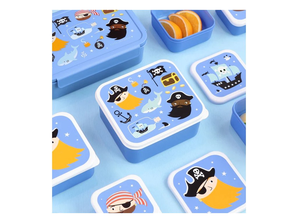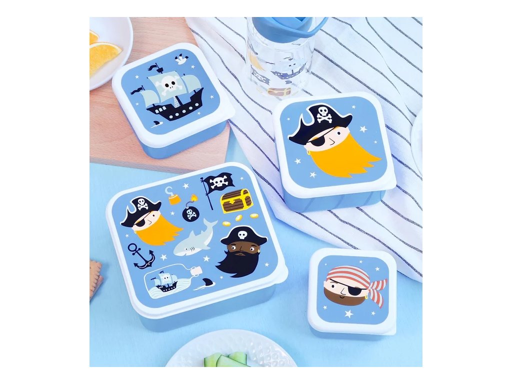 ?? Setul de cutii albastre cu pirați este ideal pentru prânzul la școală și aventuri! Conține 4 cutii practice de diferite dimensiuni, care pot fi depozitate ușor una în cealaltă – perfecte pentru prânz, gustări și fructe.