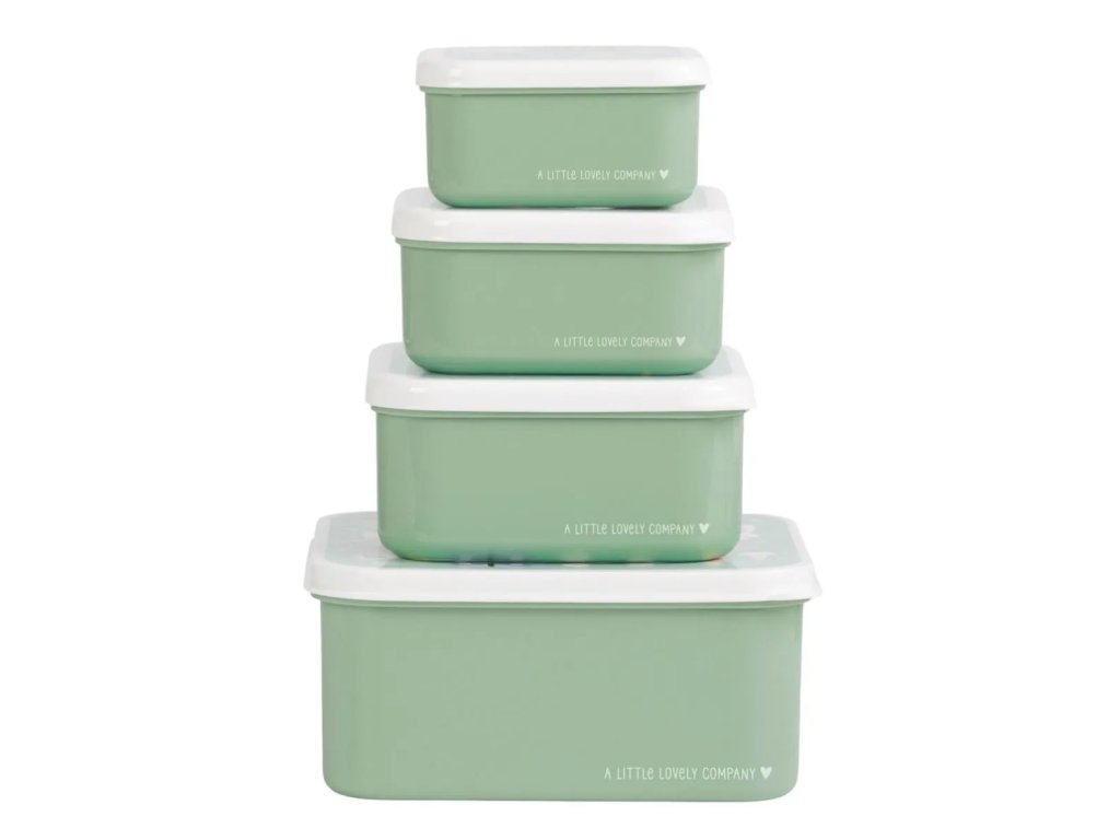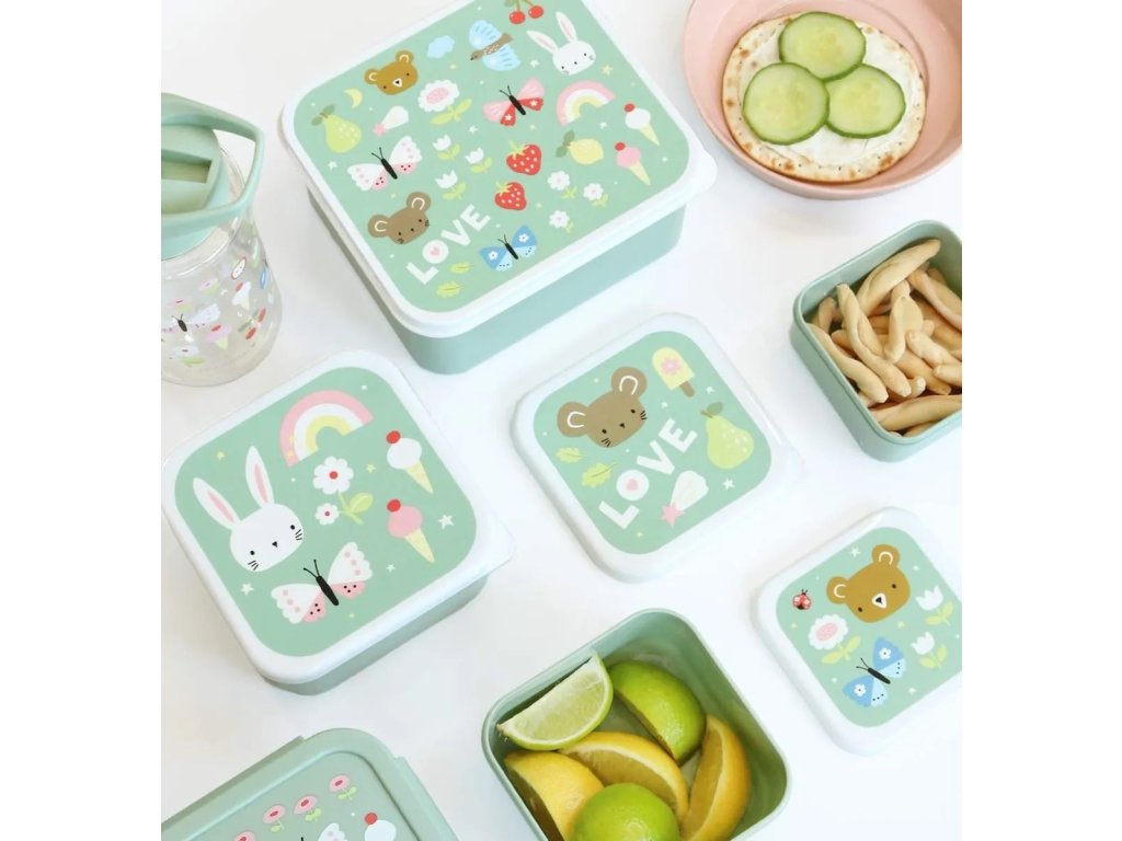Acest set de cutii pentru prânz și gustări în culoarea verde mentă, cu un motiv vesel de fluturi, căpșuni și iepurași, este ideal pentru prânzul la școală sau pentru excursii. Conține patru cutii de dimensiuni diferite, care pot fi ușor stivuite și depozitate.
