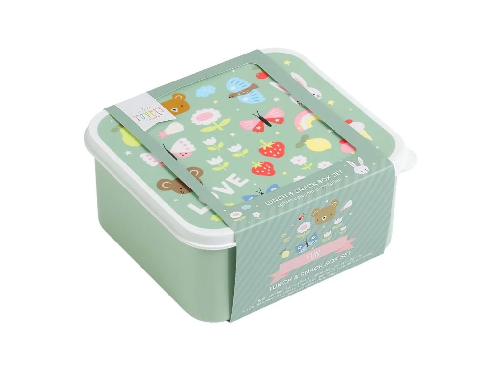 Acest set drăguț de cutie pentru prânz și cutie pentru gustări, cu motive de fluturi, căpșuni și iepurași, va încânta fiecare mic aventurier!