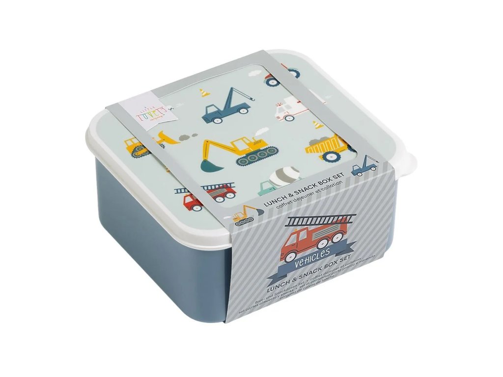 Set elegant de cutii pentru prânz și gustări, de culoare albastru deschis, cu tematică auto – ideal pentru micii pasionați, pentru școală și excursii!