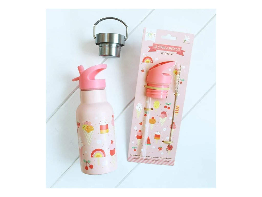 ? Oferiți sticlei dvs. o nouă viață! Setul de capace, paie și perii este ideal pentru sticla din oțel inoxidabil de 350 ml A Little Lovely – Înghețată . Ușor de curățat, lavabil manual și elegant, de culoare roz!