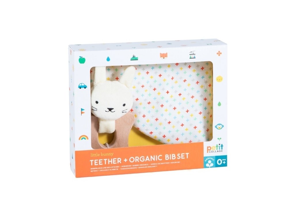 Acest set adorabil include un jucărie de dentiție în formă de iepure și un scutec. Jucăria de dentiție este fabricată din lemn masiv de fag, iar scutecul este fabricat din bumbac organic. Această combinație este ideală pentru a-ți liniști și distra bebelușul.