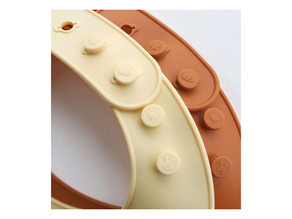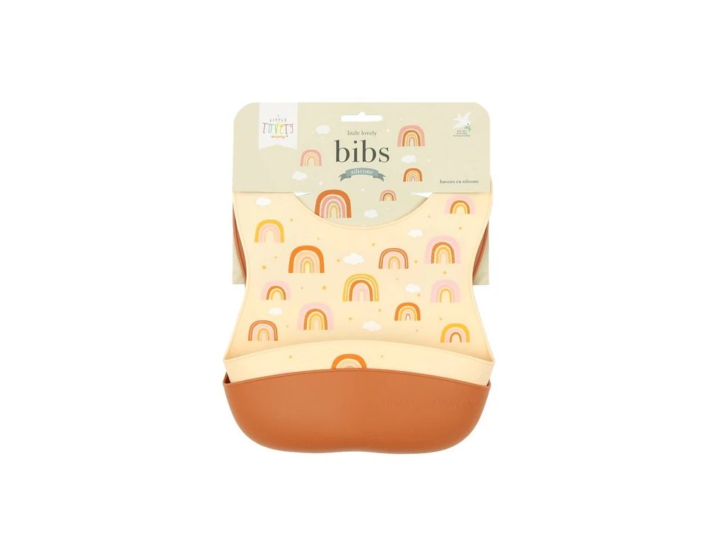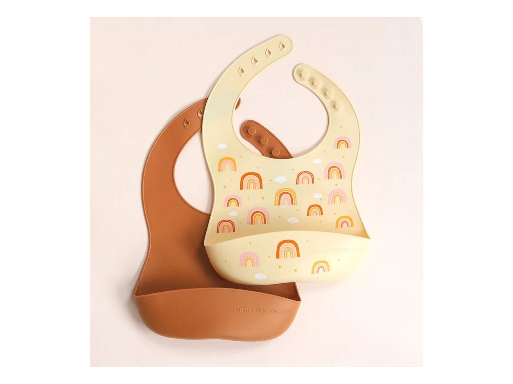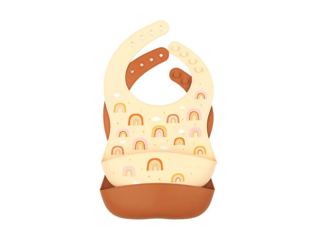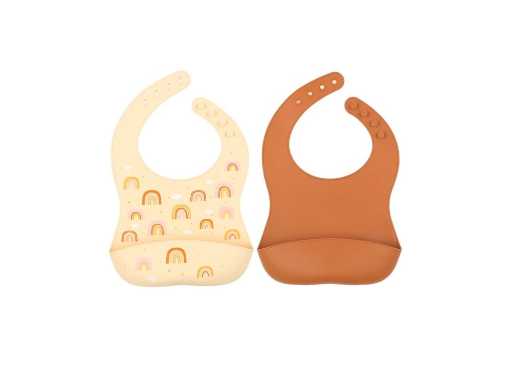 Un set elegant de două bavete din silicon de culoare galben vanilie – una cu un curcubeu frumos și cealaltă într-o singură culoare elegantă! Impermeabile, ușor de spălat și cu un buzunar practic pentru a prinde firimiturile, pentru o masă curată și confortabilă. ?