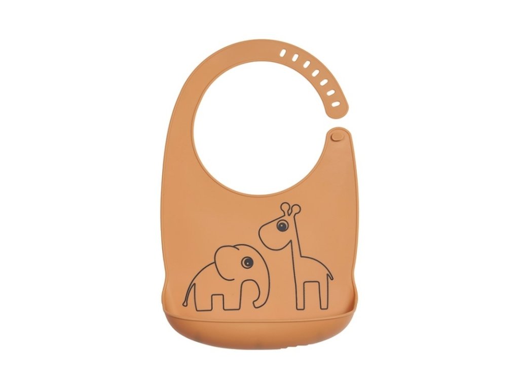 Bavetă practică din silicon impermeabil, cu Raffi și Elphee. Moale și confortabilă chiar și pentru cei mai mici copii, cu curea reglabilă în jurul gâtului. Se poate spăla în mașina de spălat vase.