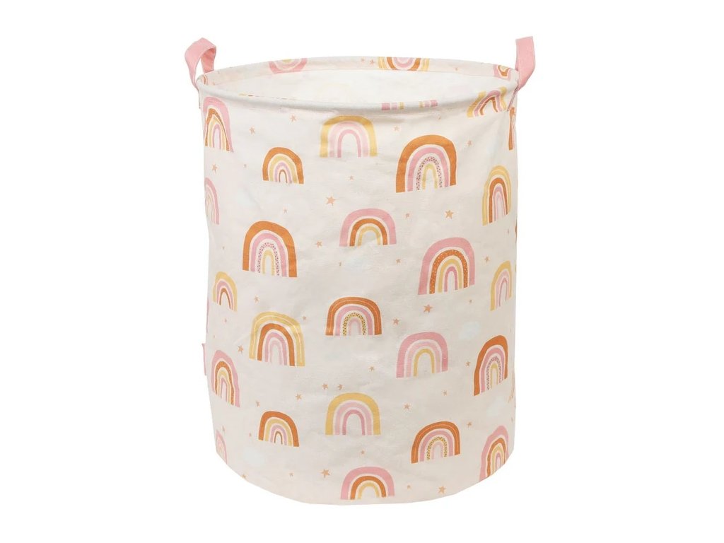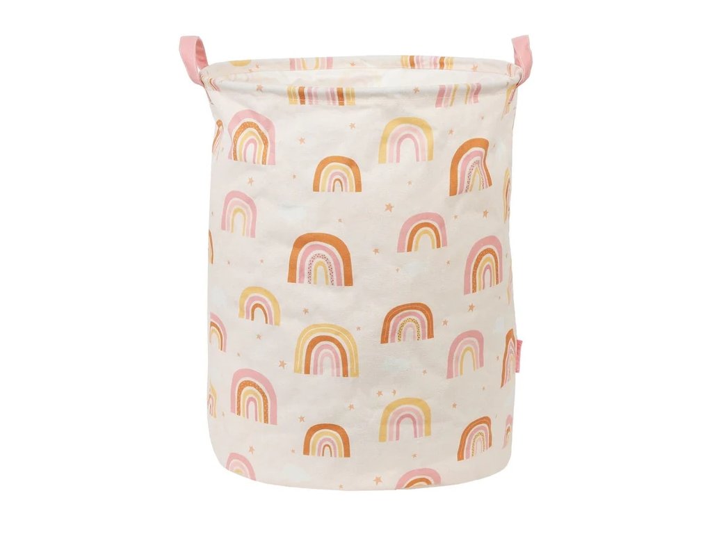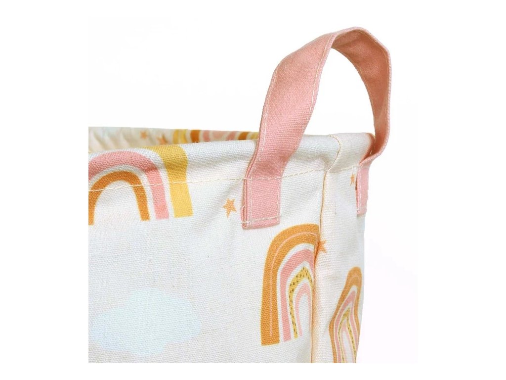 Jucării, pături sau rufe – totul într-un singur loc! ? Acest coș spațios și compact din bumbac, cu un design delicat în culorile curcubeului nu numai că va menține lucrurile în ordine, dar va și înveseli camera copilului dumneavoastră cu aspectul său drăguț. Datorită stratului interior din PE, îl puteți folosi și pentru rufe.