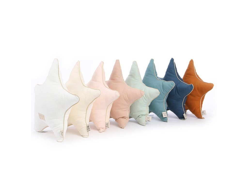 Pernă decorativă pentru copii în formă de stea, cu margini aurii. Nu este doar frumoasă, ci și moale și plăcută la atingere. Va fi un plus frumos pentru camera unei fetițe.